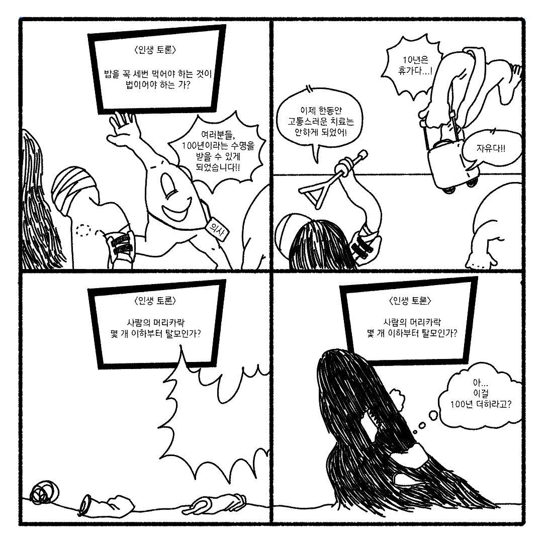 4컷 만화 <대중이란?> 39화 "여러분, 100년의 수명을 드립니다!"입니다.