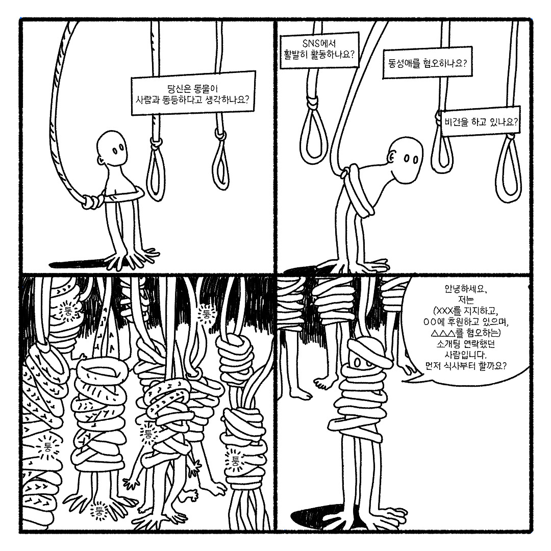 속으로 어떤 사상을 가지고 있는지, 혐오를 자주 하는 사람인지, 나와 반대되는 사람인지 그것을 가늠하기 위해서 시험문제처럼 질문을 던지게 됩니다.