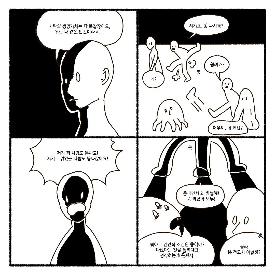 이 내용은 만화 속 캐릭터들 모습의 계기가 되는 만화입니다. 우리는 똑같이 피를 흘리고 눈물도 흘리고, 생각을 하는 사람인데 겉모습, 문화 등으로 차별하는 것이 늘 불만이었습니다. 그래서 다양한 사람들을 표현할 때 최대한 인종, 문화, 성별, 나이 등을 표현하지 않으려다 보니 저렇게 귀여운 캐릭터들이 생겼습니다!