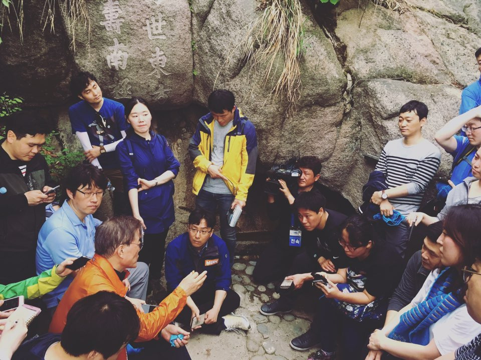 그 외에 산행을 하며 순간적으로 찍었던 사진들이 여러 장 올렸다. 한 장의 사진이 100마디 단어보다 많은 내용을 담을 수 있다는 사실을 알 수 있게 해 준 사진들이었다. 기자들에 둘러싸여 편안하게 대화를 하는 문 대통령의 모습을 통해 그가 어떤 대통령이 될 것 같다는 가늠을 할 수 있는 사진도 있었다.