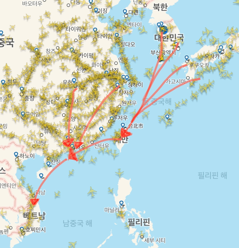 여기서 잠깐! 이륙 순서 하나 밀렸을 뿐인데 왜 10분이나 더 기다려야 하냐고요? 바로 ‘간격 분리’ 때문입니다. 항공기가 다니는 길인 ‘항로’는 자동차 도로와 달리 가상의 한 선으로 이어집니다. 물론 수직으로 나뉜 고도별 차선(?)이 있습니다만, 항공기 성능 및 연료 효율성 등을 고려할 때 현실적으로 이용 가능한 차선은 기껏해야 편도 2~3차선 정도라 보시면 됩니다. 설상가상으로 통상적으로 사용되는 동남아행 항로는 홍콩을 거치는 길 하나뿐이라는 사실!