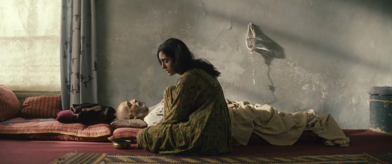 남편은 누워있다. 어떤 일이 있었는지는 모르지만 남편은 누워있고 아내가 되는 여인은 초조하게 남편 옆에 앉아 말을 꺼내고 있다. 그리고 지속되는 아프가니스탄의 내전 상황에서 불안과 초조함이 함께하고 있다. 여인은 이슬람의 종교인의 말을 빌려 2주 정도 지나면 일어날 것이라고 말한 게 이루어지지 않는다며 조금은 다급한 어투로 남편 곁을 지키고 있다. 남편 곁을 지키고 있던 여인은 쓰러진 남편을 일으키기 위해 집 주변의 약국에서 수액을 구하려고 하지만 돈이 없어 수액을 구입하지 못한 채 임시방편으로 설탕물을 남편 입에 물린다. 돈을 빌리기 위해 '이모'집을 찾았으나 '이모'는 이사를 가고 사라진 뒤였다. 이윽고 두 아이들이 쓰러진 남편 방에 들어가 장난을 치자, 여인은 급하게 아이들을 말린 후 방 밖으로 내보낸다. 여인은 지극정성으로 할 수 있는 선에서 모든 간호를 하고 있는 셈이다.