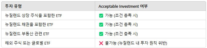 뉴질랜드 투자이민 프로그램에서는 뉴질랜드 상장 주식을 포함한 ETF나 채권 ETF 등은 Acceptable Investment로 인정될 가능성이 크지만, 해외 자산(예: 미국, 유럽 등 글로벌 ETF)에 투자하는 것은 허용되지 않습니다. 즉, 뉴질랜드 내에서 FMA의 승인을 받은 ETF를 선택하면 투자이민 요건을 충족할 수 있지만, 해외 시장에 상장된 ETF를 선택하면 Acceptable Investment로 인정되지 않기 때문에 투자이민 신청 조건을 충족하지 못할 수 있습니다.