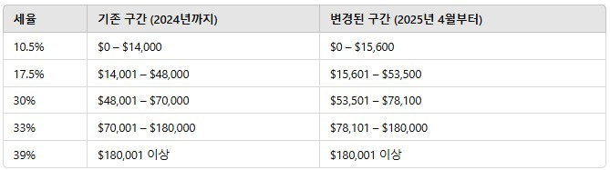 기존의 세율(10.5%, 17.5%, 30%, 33%, 39%)은 그대로지만, 각 세율이 적용되는 소득 구간(threshold)이 다음과 같이 바뀝니다: