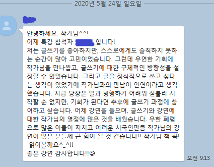 책쓰기 공개 특강 후 받은 문자입니다.