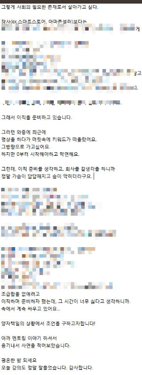 자기소개와 자신의 현재 어려운 점을 A4 두장 정도의 많은 분량으로 자세히 써서 카톡을 주십니다.
