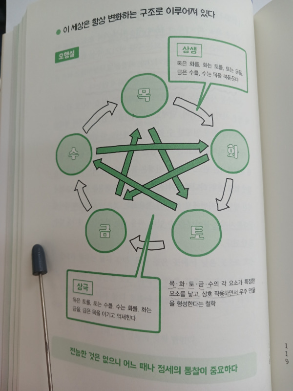 만물은 목木, 화火, 토土, 금金, 수水 다섯 가지 요소(오행)로 이루어진다. 목은 토를 이기고, 토는 수를 이기고, 수는 화를 이기고, 화는 금을 이기고, 금은 목을 이긴다. 이것을 오행설이라고 하는 것처럼 이 세상에 항상 이기는 요소는 존재하지 않는다.