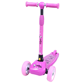 분홍색 킥보드는 인도에서 찻길로 미끄러지듯 흘러내려갑니다.