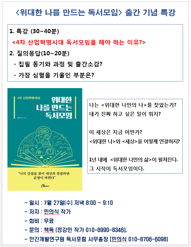민의식 작가님의 신간 <위대한 나를 만드는 독서모임 > 출간기념 특강을 합니다. 왜 4차 산업혁명시...