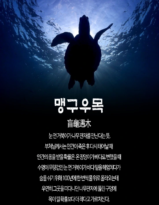 100년에 한 번씩 바다 위로 머리를 내미는 눈먼 거북이가 마침 바다 위를 떠다니는 구멍 뚫린 나무판자에 정확히 머리를 내밀만한 기적이며, 그 높다는 수미산 꼭대기에서 바늘 한 개를 떨어뜨려 산밑에 놓여있는 겨자씨 한 알이 꽂힐 만큼 기적적인 일입니다.