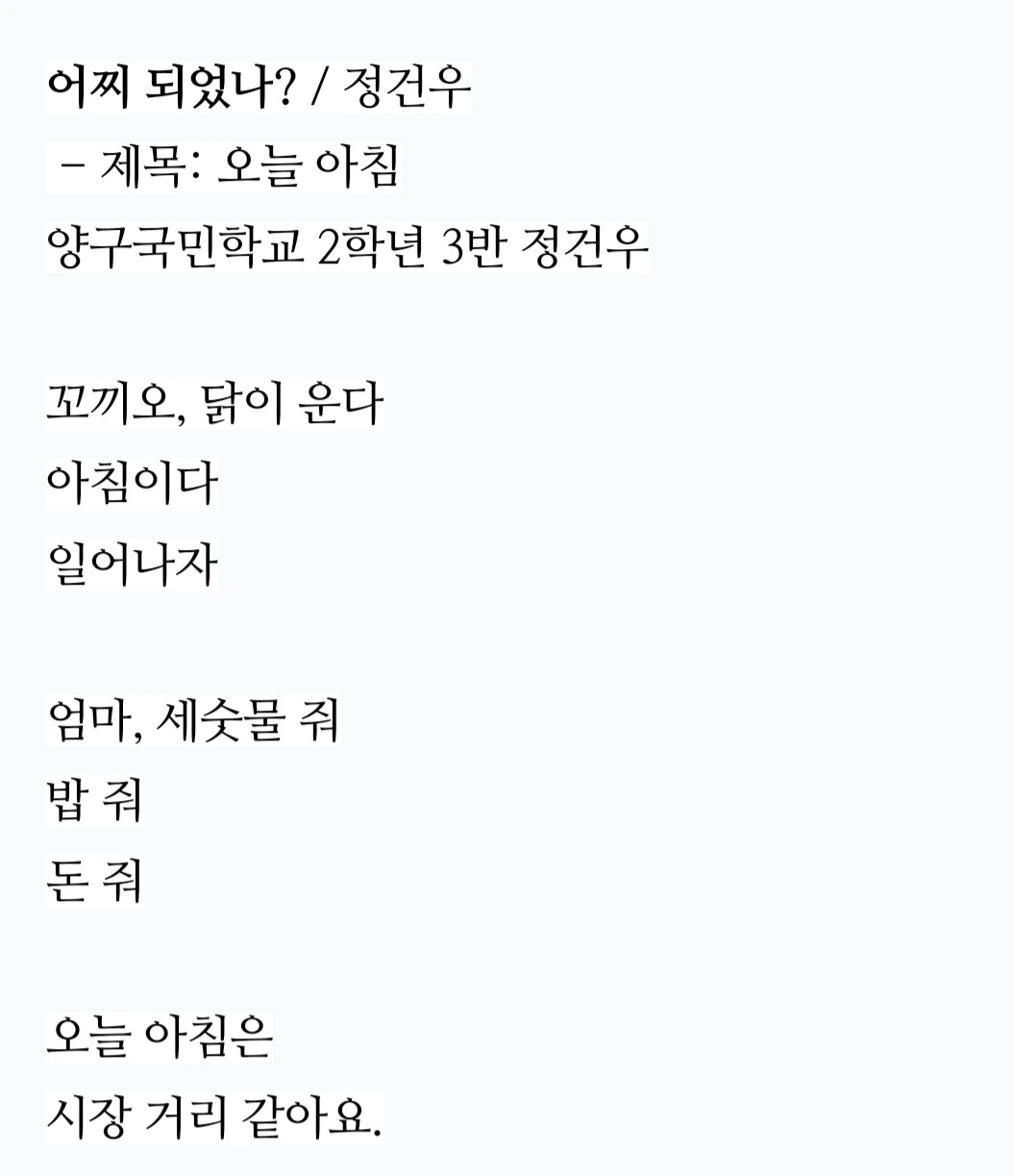 그중에 단연 압권은 전 학생 글짓기 대회였다. 아마 추계 백일장으로 기억한다. 국민학생부터 고등학생까지 양구 관내의 모든 학생들이 참여하는 대회였는데, 운문부와 산문부로 나눠 겨루는 행사였다. 대상은 운문 산문을 통틀어 1명에게 주어지는, 마치 과거시험 정도의 위상이 있었다. 각 학교 교장 선생님들의 경쟁의 장이었고, 학교의 위상을 드높이는 기회의 장이기도 했던 뜻깊고 전통 있는 잔치였다. 내일까지 원고를 내란 담임의 엄명에 전전긍긍하던 나는 다음 날 아침밥을 먹다 말고 그야말로 일필휘지로 30초 만에 위의 내용을 메모하였다. 일체의 수정이 없는 채로 원고지에 적어 제출하였다.