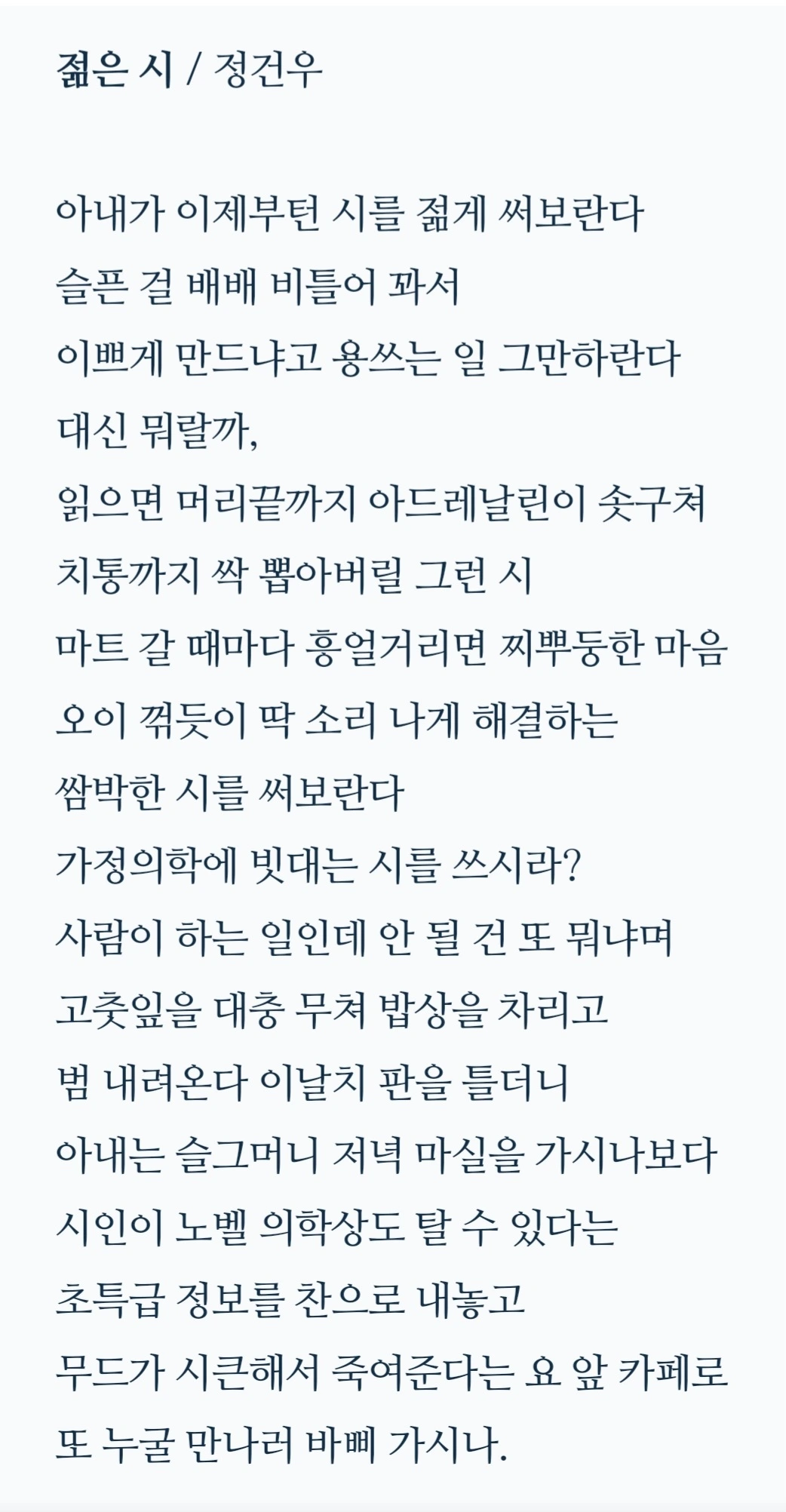아내는 내 시의 제1 감별사다. 새로 쓴 시를 읽고 10초 후의 반응이 좋으면 나는 기분이 좋아진다. 그 반대면 또 몇 달을 끙끙 앓아야 한다. 사십 년 가까이 살면서 아내는 내 감성의 한 부분에 깊숙이 자리하여 나와 같이 숨 쉬고 있다. 아내의 시선, 감각, 조언, 질타와 칭찬은 나를 단련시키는 도구가 되기에 충분하다. 그런 아내가 내 시의 중앙부를 어김없이 관통하는 아픔에 이젠 이력이 나는 모양이다. 아무리 명랑하게 써 놔도 어느 구석인가에 슬픔과 아픔이 숨어 있다는 것이다. 꼭 그런 느낌이 들도록 일부러 그러는 거 야니냐고 주는 핀잔이 대단하다. 나는 속으로 내 시의 일관성을 늦게나마 알아주는 아내의 노안에 쾌재를 불렀지만 아내는 좀 강경하게 시큰둥하다.