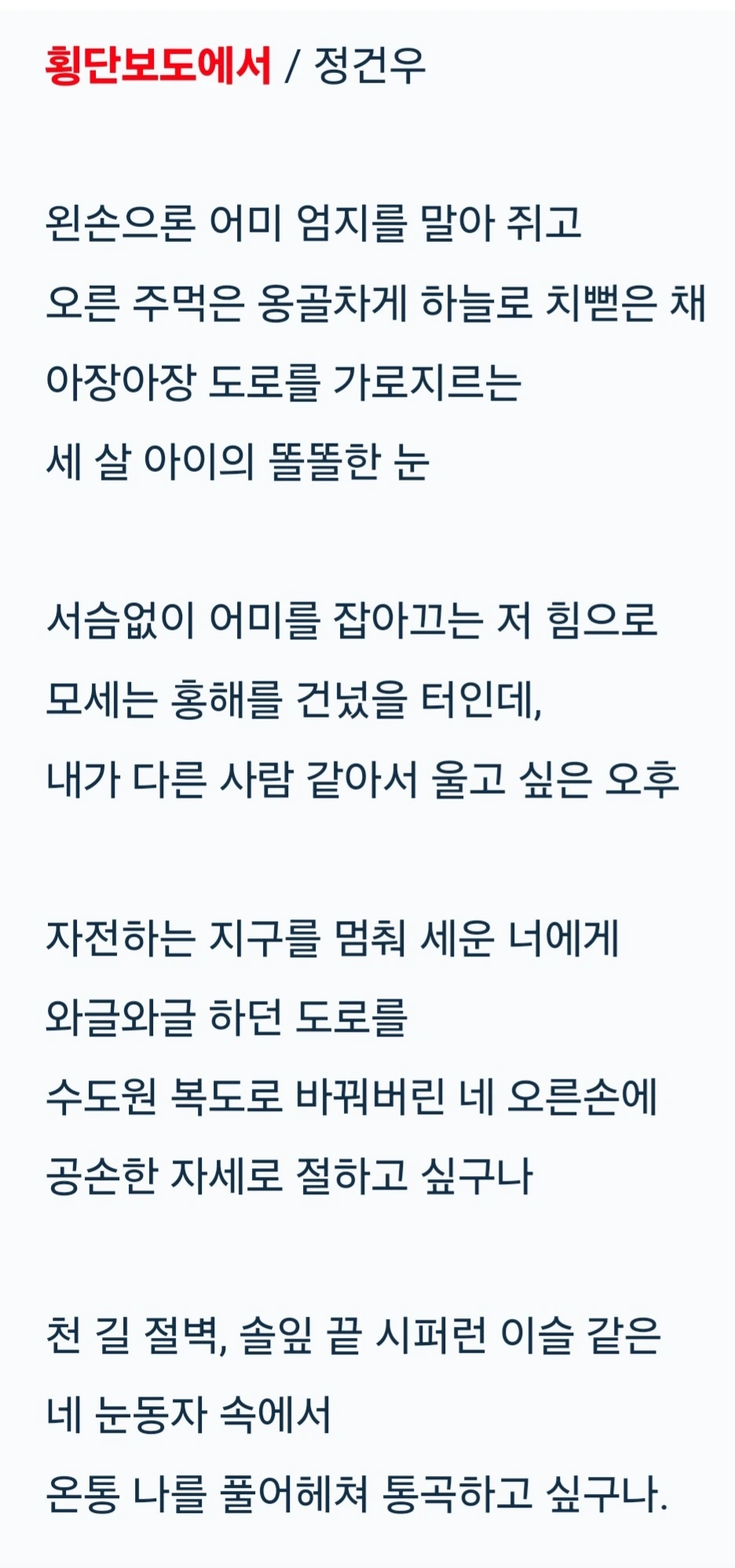아이의 저 똘똘한 믿음이 발화하는 순간, 지구의 자전은 멈춘다. 시끌벅적한 횡단보도 전체가 울릉도 앞바다로 날아가 처박히는 기적이 일어나는 것이다. 믿음이란 저 아이의 눈처럼 천의무봉해야 하는 가치다. 바람도 새지 않을 만큼의 틈조차 허용치 않는 것이 믿음의 밀봉성이다. 오전의 힘든 서울 출장을 끝내고 오후 늦게 퇴근하는 횡단보도에서 저 아이의 똘똘한 눈과 마주쳤을 때, 양파를 깔 때처럼 쓰라린 눈물을 흘렸다. 정말이지 차 문을 박차고 나가서 이 세상에서 가장 공손한 자세로 아이 앞에 엎드려 절하고 싶었다.