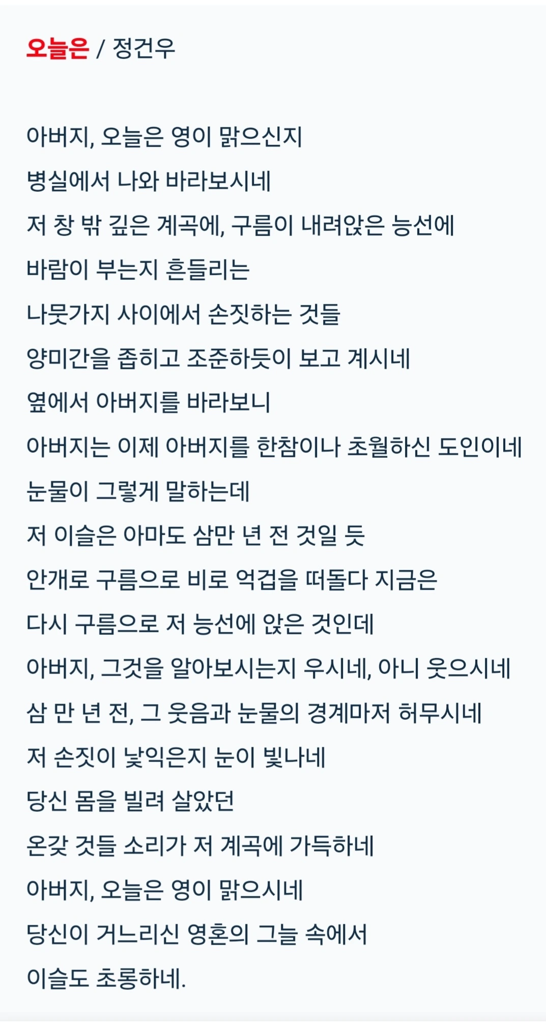 기저귀와 물티슈 등 병실 용품을 사서 돌아왔을 때 아버지는 병원 복도에 서 계셨다. 참으로 오랜만에 병실 밖으로 나오신 것이다. 간호사가 적당한 거리에서 아버지를 지켜보고 있었다. 아버지는 창밖 너머 야산의 계곡을 보고 계신 것 같았다. 비스듬한 옆모습에서 어떤 단호한 것이 스쳐 지나는 순간 아버지가 치매 노인이라는 느낌이 사라졌다. 몇 분이나 그러고 계셨을까?. 때로는 웃으시는 듯하고, 어떨 땐 우시는 듯한 입술 모양과 그득한 눈물은 내게 매우 생경한 충격을 안겨다 주었다.
