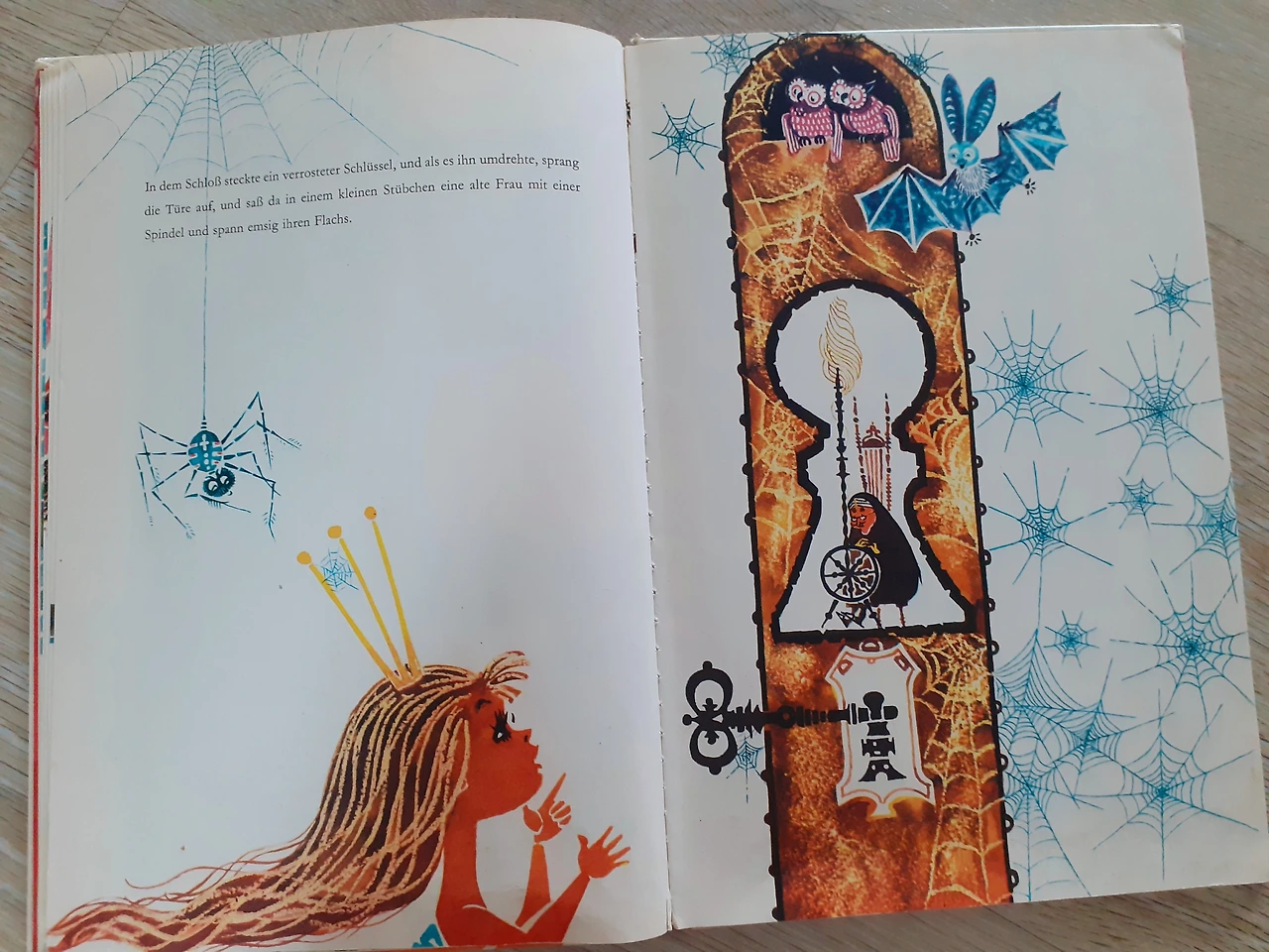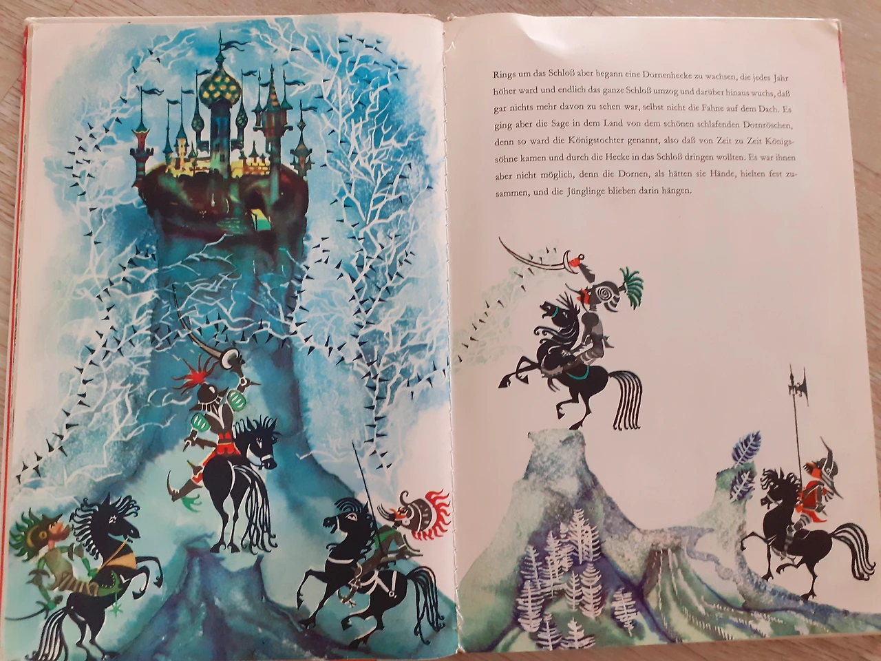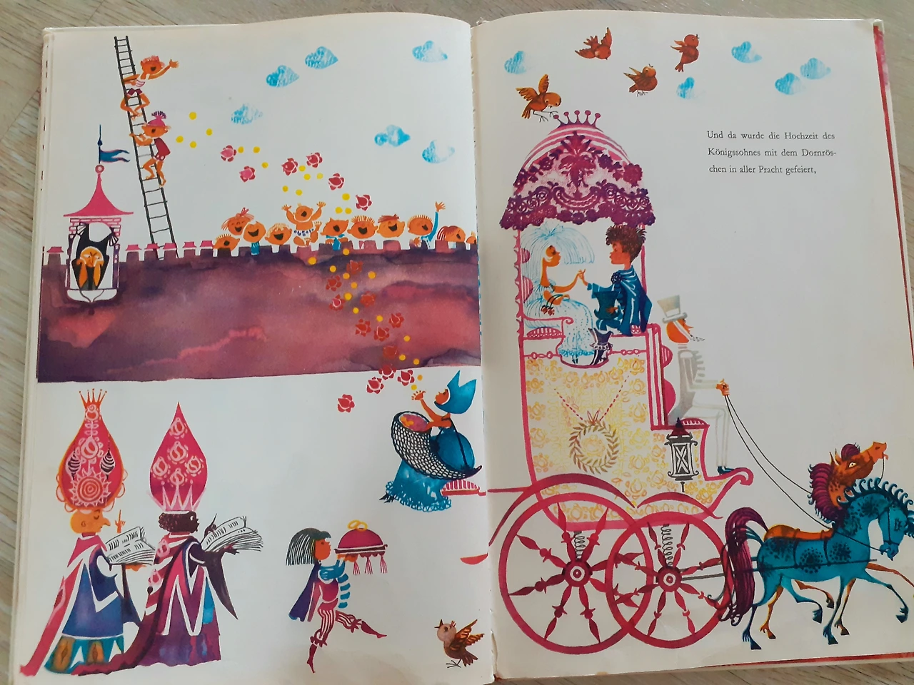이 책은 독일 프라이부르크 보봉마을 근처 큰 느티나무 그늘 아래 열린 벼룩시장을 갔다가 발견한 그림책이다. 펼친 순간 그림이 무척 마음에 들어 좀 많이 낡았지만 내용 불문하고 데려왔는데 알고 보니 조금 특별한 책이었다. 1960년대 동독에서 초판이 발행되었고 <잠자는 숲 속의 공주>의 그림형제 버전 <들장미 공주> 이야기였다. ‘레진 그루베 하이네케’ 라는 일러스트 작가도 동독에서 대단히 유명한 사람이어서 그림만으로 충분히 가치가 있을 거라 어림짐작했던 게 거의 맞았다. 화려하면서 환상적이고 해학적인 그림이 정말 일품이다.