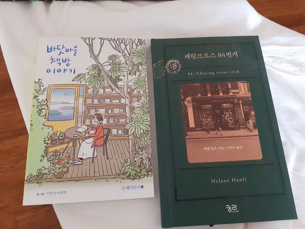 가장 최근에 다녀온 당진 면천면에 가면 <오래된 미래>라는 자전거포를 리모델링한 멋진 책방이 있었다. 들어가 보니 원래는 한옥이었는지 천장 서까래가 멋스럽고 2층으로 올라가니 헌책들 속에 <채링크로스 84번지>가 눈에 띄었다. 마침 그 무렵 브런치 작가님들 통해 이 책에 대한 특별한 이미지가 생기고 있었는데 운명적으로 그곳에서 딱 만났다. 주인장 책이라고 안 판다는 걸 억지로 얻었고 그걸 또 사진 찍다가 거기 두고와 결국 우편으로 받은 귀한 책이 되었다. <바다 마을 책방 이야기>는 앞에 소개한 <남해의 봄날> 책방 스토리가 만화로 된 책이 있어 가져왔다. 표지 그림의 부인은 마을에 사람이 점점 줄어 이사까지 생각할 때쯤 옆집에 생긴 책방 때문에 다시 행복해진 사람이다. 부인의 모습에 나를 넣어 본다.