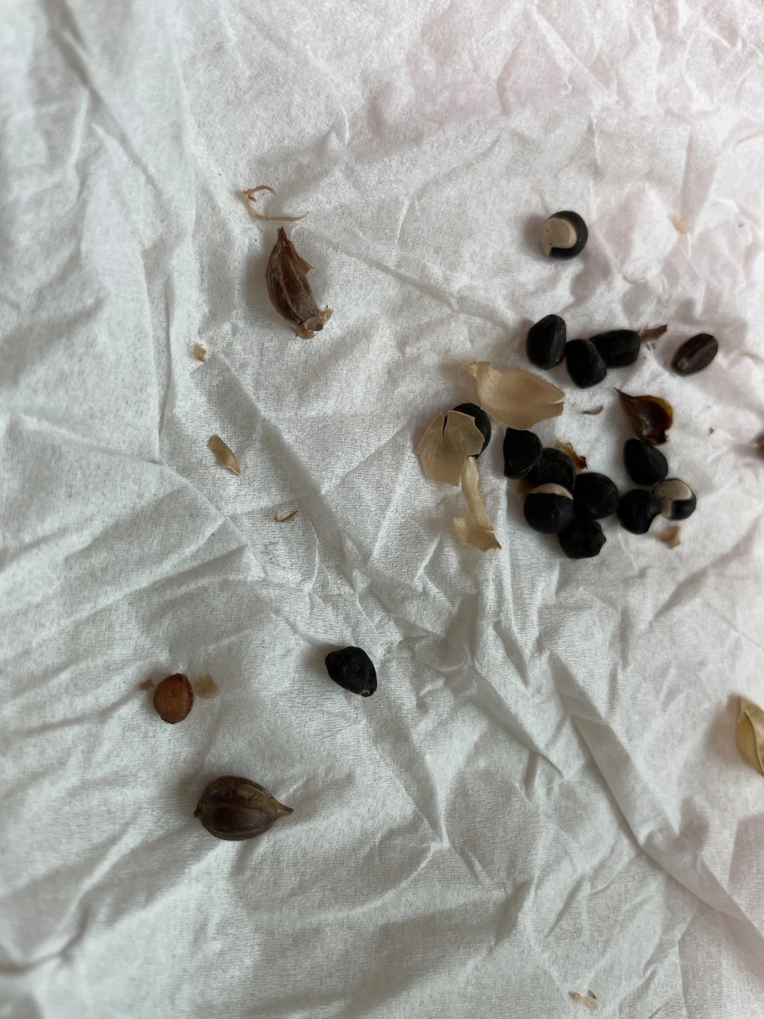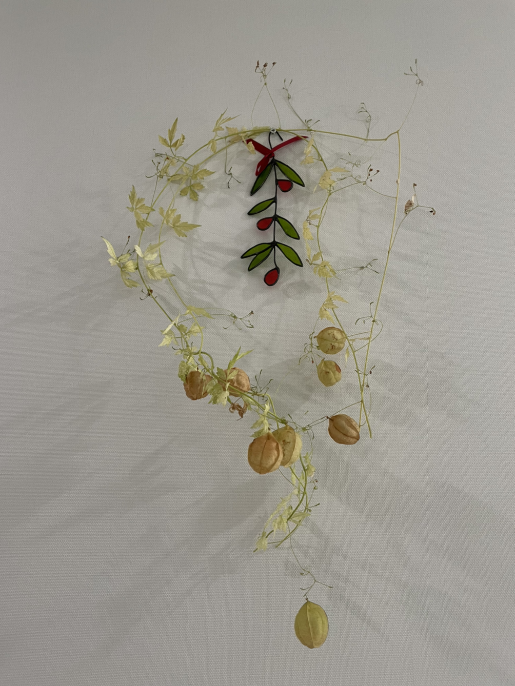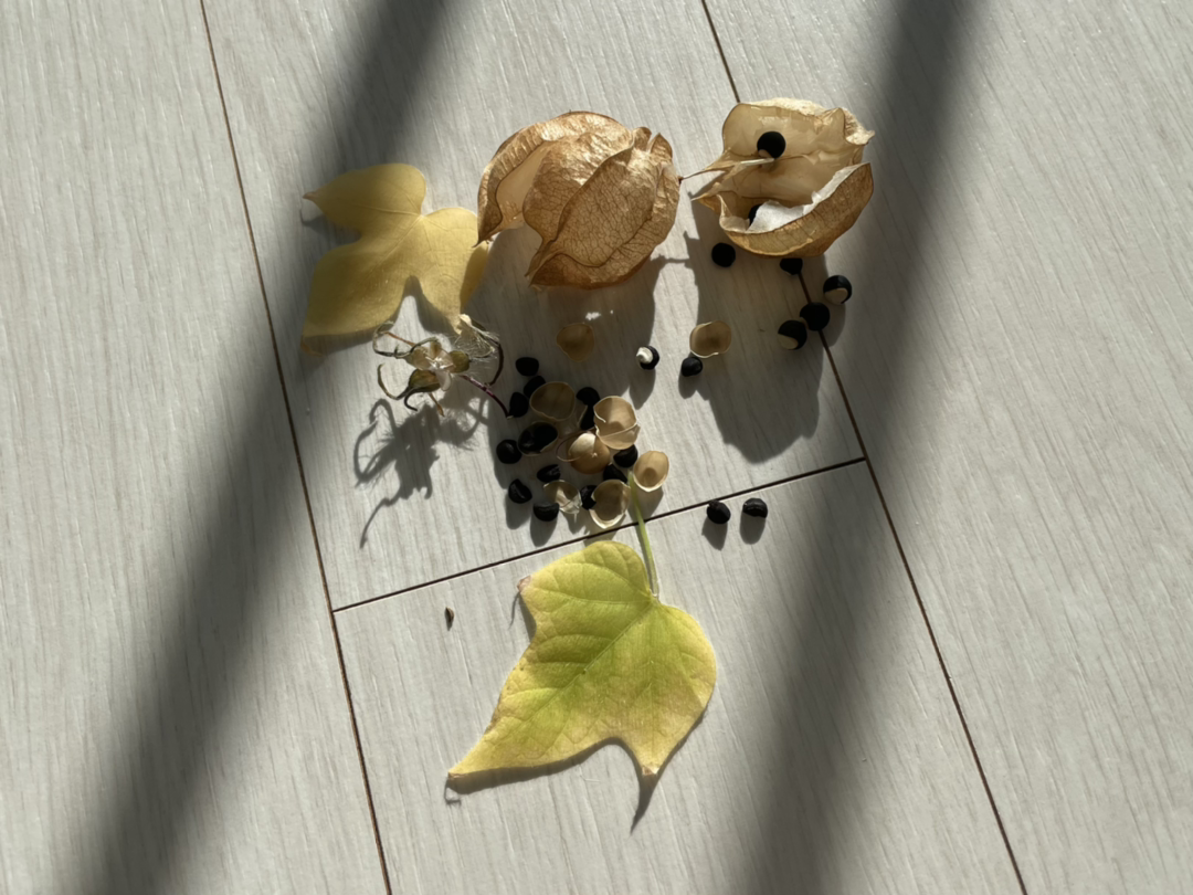 벌써 9월 마지막 주, 수확의 계절이 다가오고 있다. 9월을 강타했던 태풍 그리고 또 비 등 고르지 못한 날씨에도 끄떡없던 풍선 열매가 밤낮의 일교차에는 변화를 보이기 시작했다. 점점 가을빛을 닮아가는 모습에 더 이상 화분에 물을 주지 않으며 씨 받을 꿈을 키우던 한날, 어인 일인지 태풍 때보다 더한 바람이 풍선초가 있는 창쪽으로 몰아쳤다. 가장 가벼워진 시기에 가장 강한 바람이라니, 손에서 놓친 풍선 꼴이 될 것 같은 불안감에 과감히 대를 잘라 가지들을 손에 쥐었다. 얼떨결에 수확을 한 것이다. 특별한 선물을 받은 것처럼 금세 풀어보기(씨앗 털이) 아까워 리스를 만들어 벽에 걸어 보았다. 그리고 딱 풍선 한 개를 열어 보다가 궁금해하지 않았던 비밀이 풀리는 광경을 발견한다. 까만 씨앗에 사람이 일부러 그려놓은 듯한 하얀 하트 무늬가 무척 신기했을 뿐이다. 풍선 속 하약 속적삼 같은 막을 중심으로 들러붙은 씨들은 그 부분만 까맣지 않고 하트 모양 작업이 되어있다. 자연이 하는 일이 어쩜 이리 자손 대대로 정교한지….