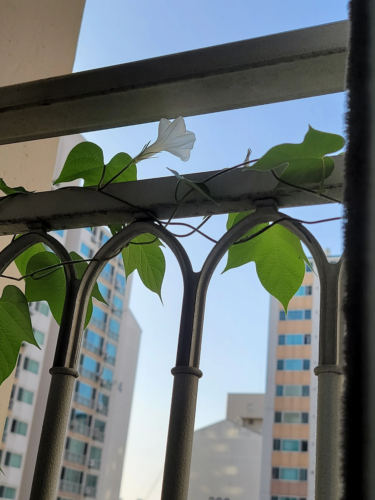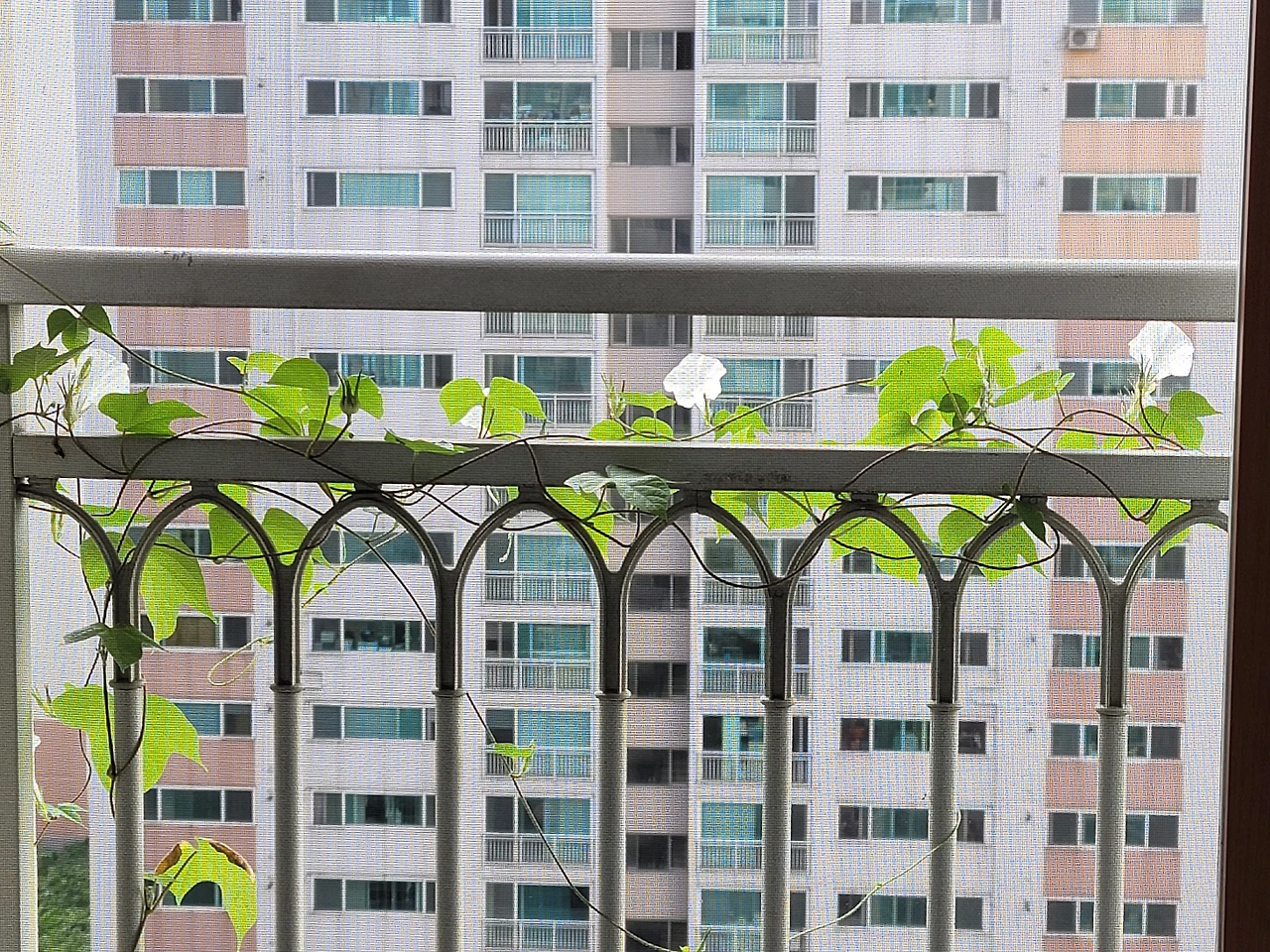 그녀의 풍선초와 하얀 나팔꽃은 안전하고 정리된 베란다에서 관리를 잘 받아 쪽 곧고 가지런히 덩굴을 성큼성큼 자아내더니 하얀 꽃을 일찍 피웠다.