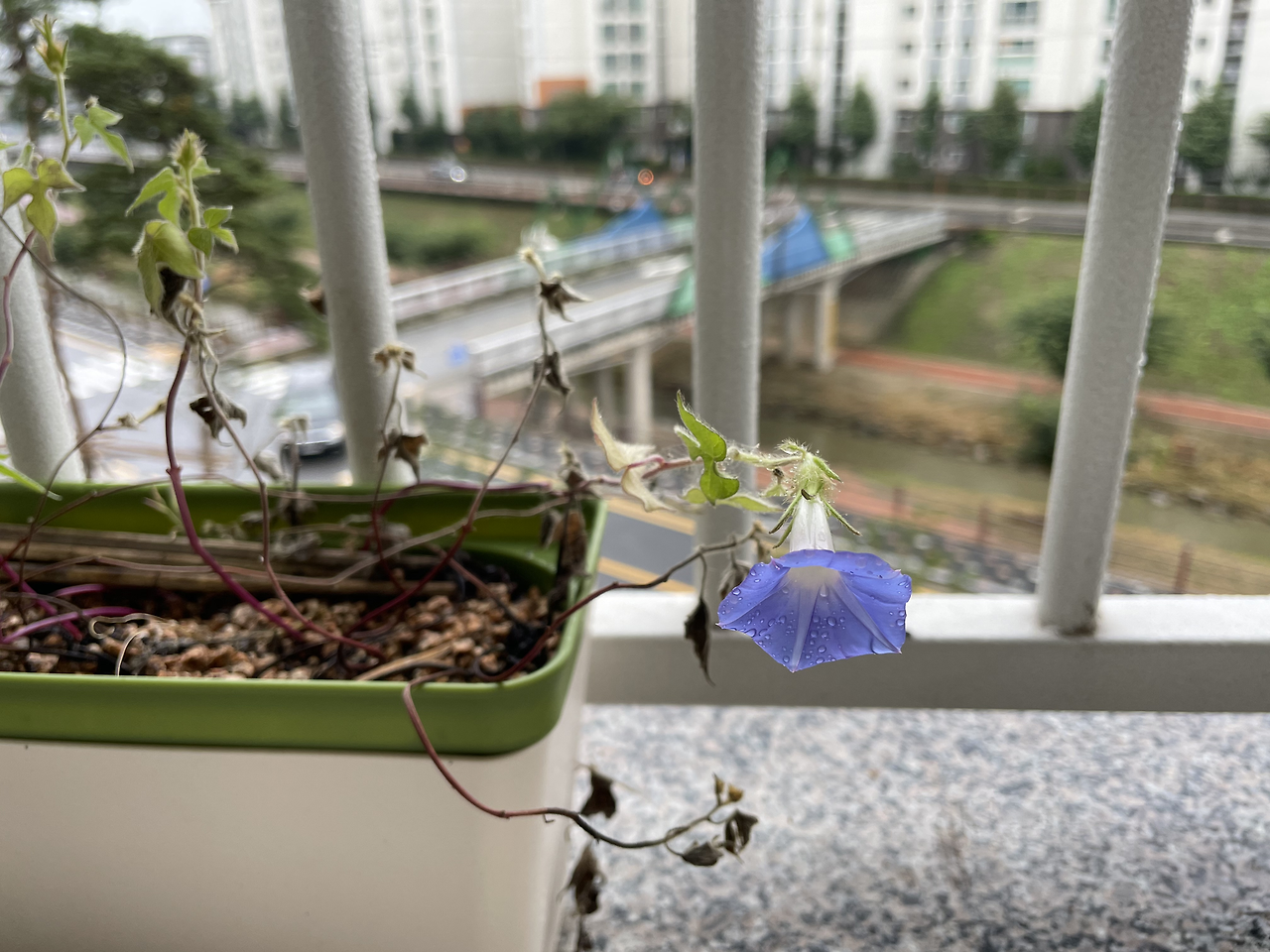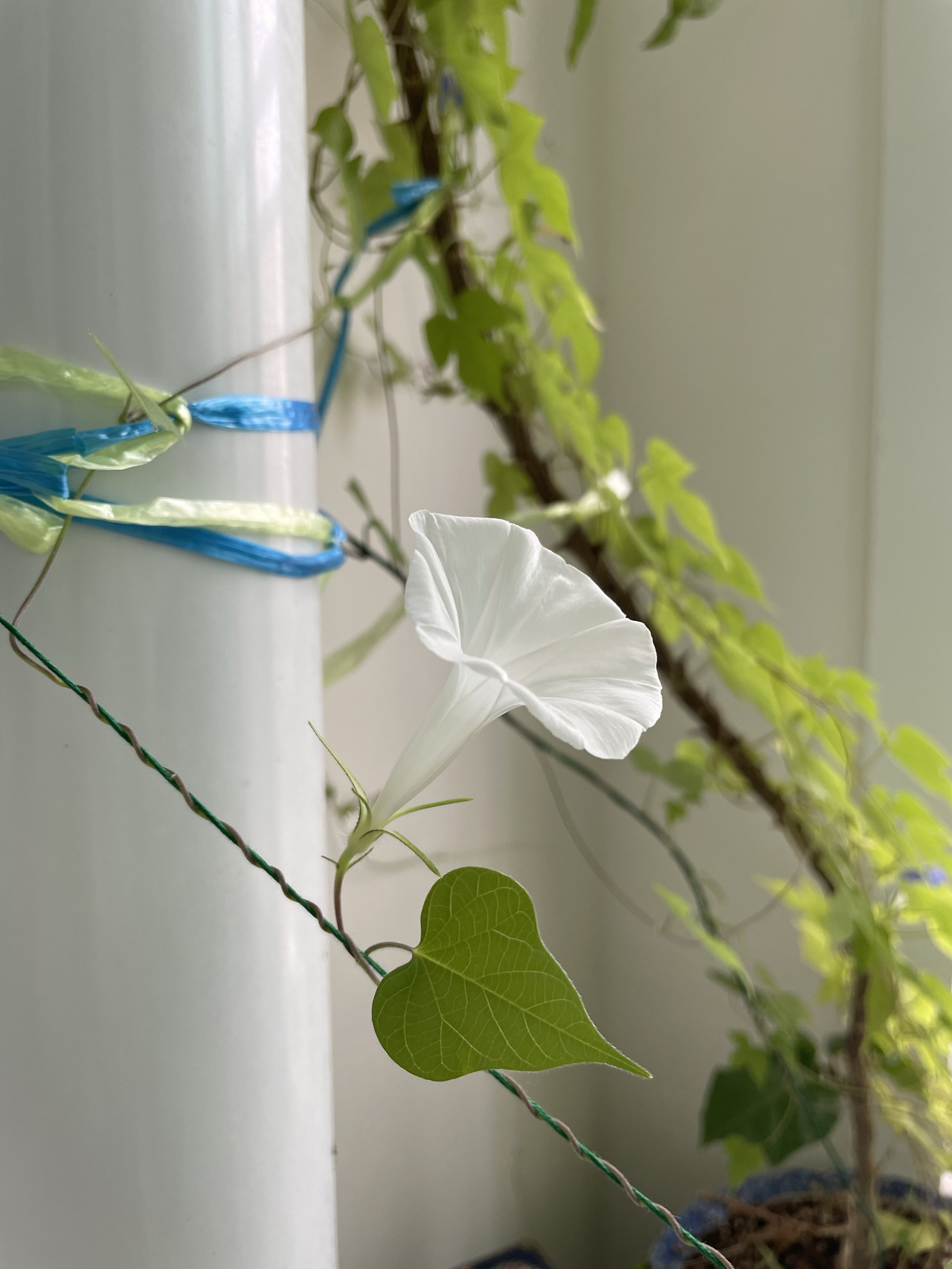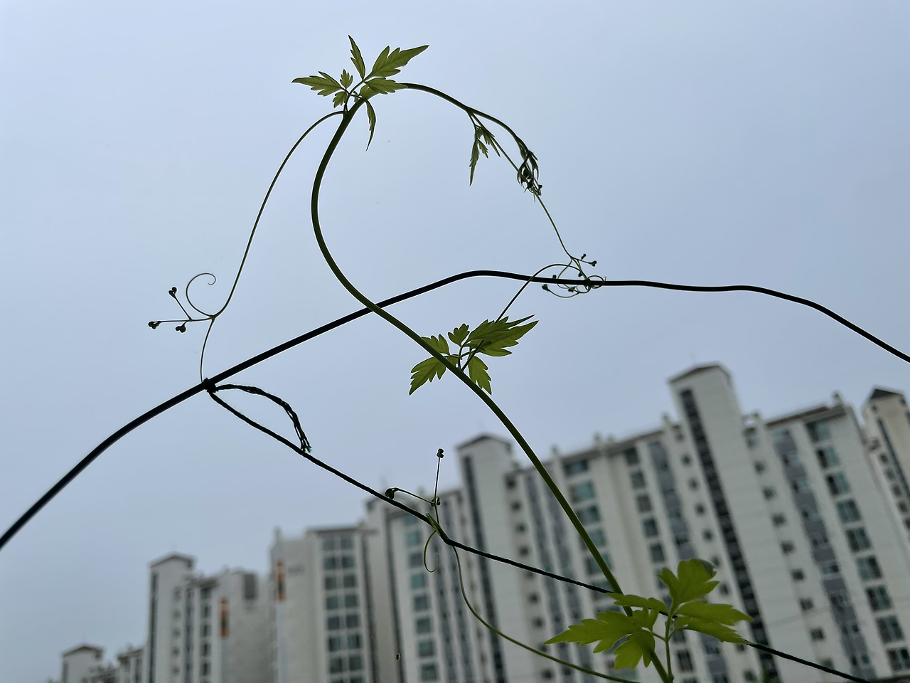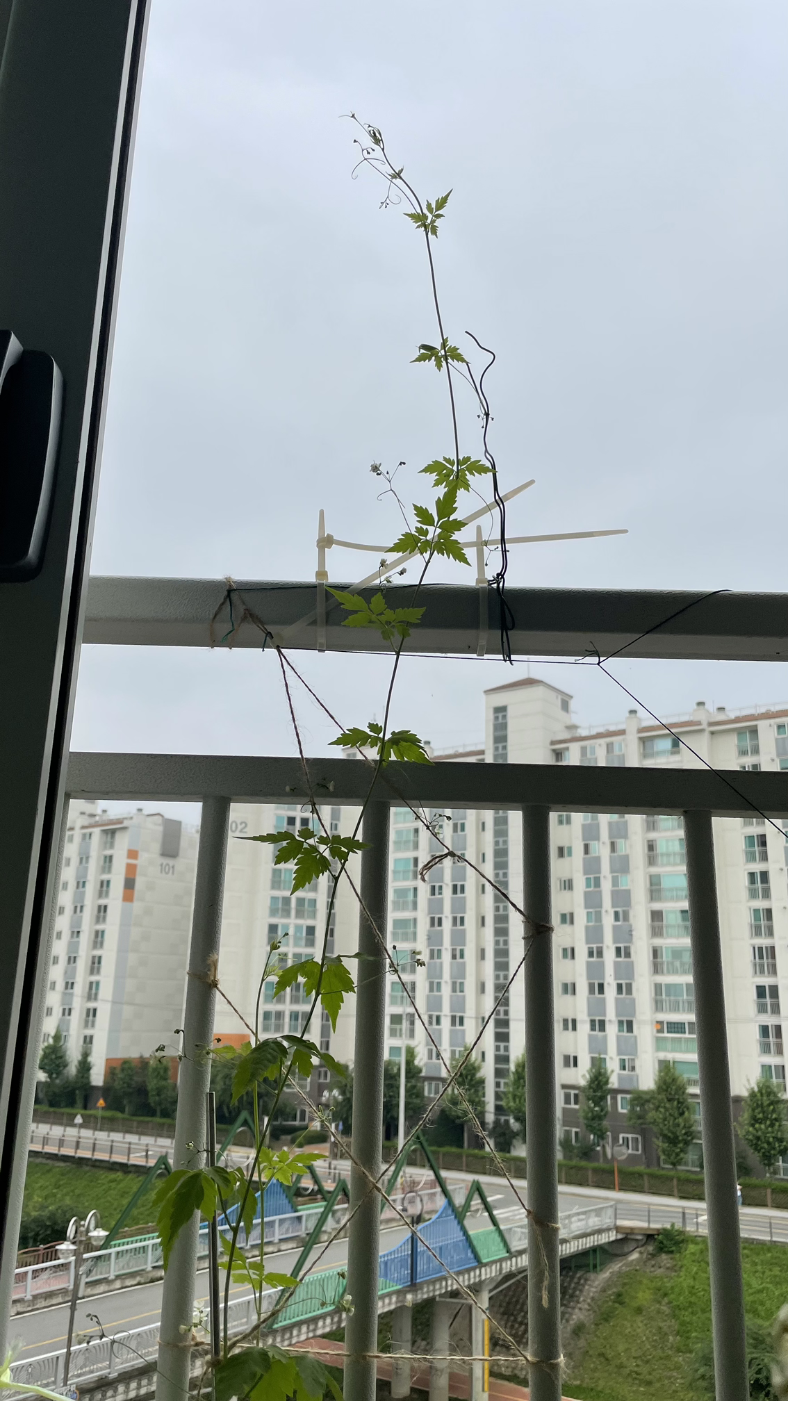 얻은 씨앗 네 알이 모두 발아되어 베란다 바깥 난간에서 무섭게 넝쿨을 자아내며 위로만 올라갔다. 처음 심어본 거라 위로만 향해 가는 줄 몰라, 난간 대을 넘긴 이후에는 매일 이 아이의 공중살이를 도우기 위해 고민해야만 했다.