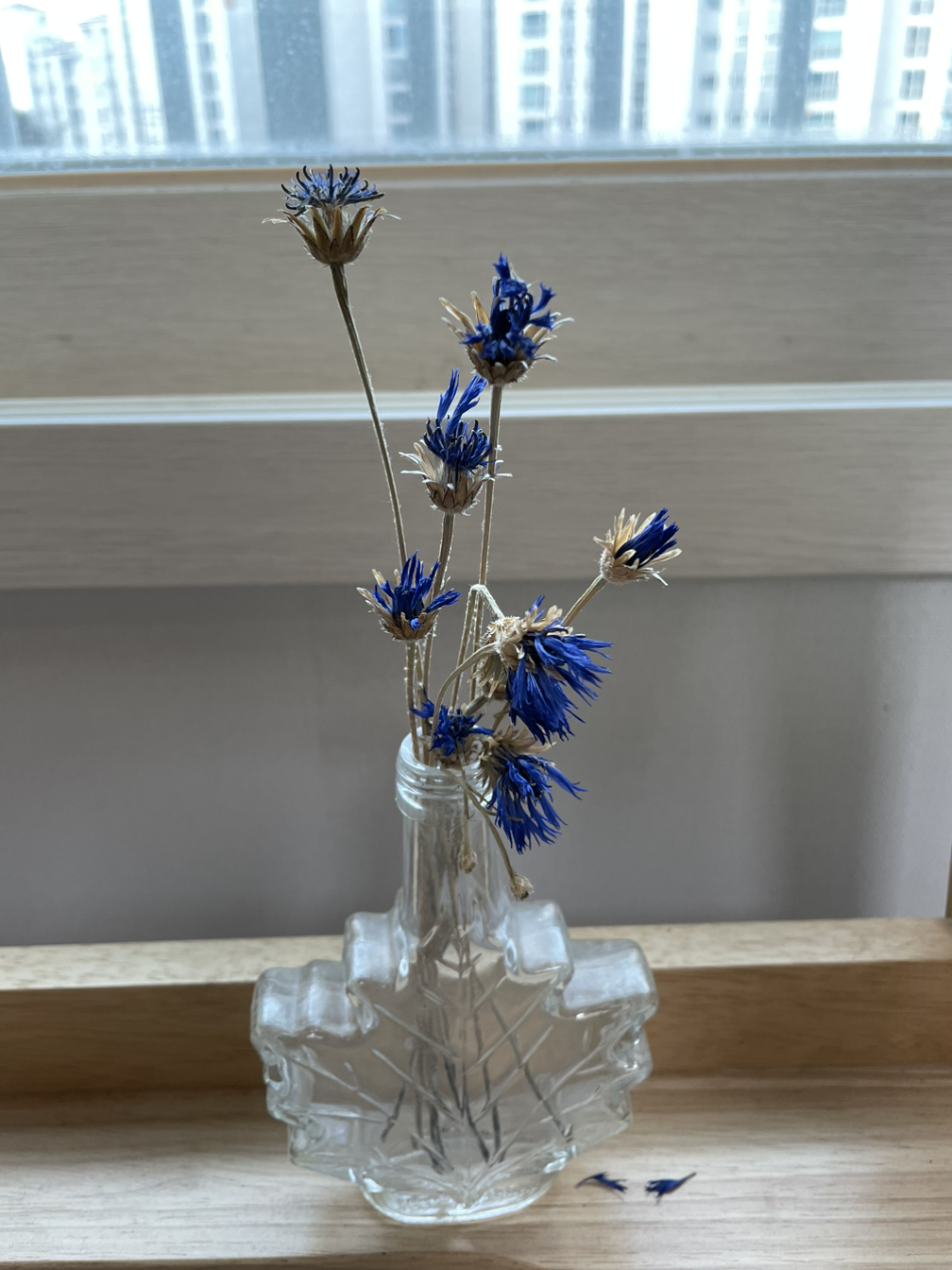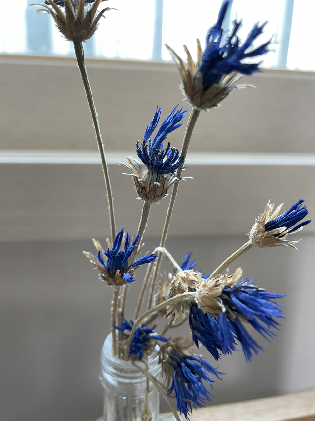 정확히 지난 12월 29일, 또 느릿느릿 강변을 걷고 있었다. 그곳은 큰 도로에서 깊이 내려앉은 길이라 혹한에도 낮시간에는 바람도 없고 따뜻하다. 오른쪽엔 강, 왼편은 경사진 방벽인데 그곳에 파란 빛깔이 멀찍이서 일렁거리는 게 보인다. 오잉, 무채색 일색인 곳에 저것은 무엇인고? 수레국화가 만발했던 곳인데 아직도 살아있다고.. 수로부인에게 꽃을 바치기 위해 암벽을 올랐다는 노인처럼 낑낑대며 올라가 보았다. 맞았다, 수레국화. 놀랍게도 자연상태로 말라 고운 빛깔을 그대로 유지하고 있는 수레국화. 파란색이 농축되어 코발트 색에 가까웠다. 한송이만 보고 달려갔는데 주변에 그런 드라이플라워들이 제법 있었다. 후덜 거리는 다리에 힘을 주며 부서지지 않게 조심하여 몇 송이 꺾어 왔다. 한겨울 야생화를 이렇게 만날수 있고 꺾을 수 있었다.