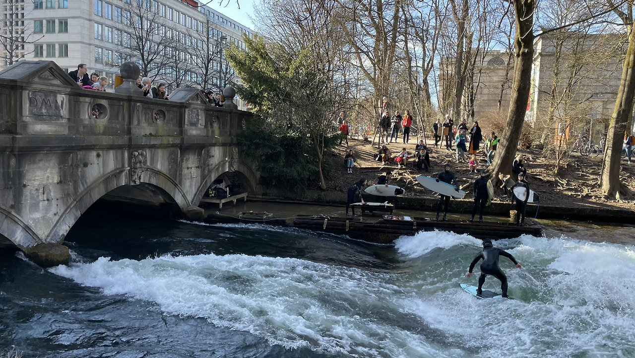 물길에 홀려 걷다가 더한 장면을 만났다. 서핑을 하는 사람들! 광막한 바다, 파도와 조합이 맞는 서핑보드타기가 도심과 공원 경계에 있는 냇가에서 이루어지고 있었다! 지나가는 사람들은 잠시 멈추어 누구라도 구경꾼이 된다. 길가에서 다리위에서 서퍼와 물살의 한판 겨루기에 덩달아 마음을 실은 나그네가 되었다.