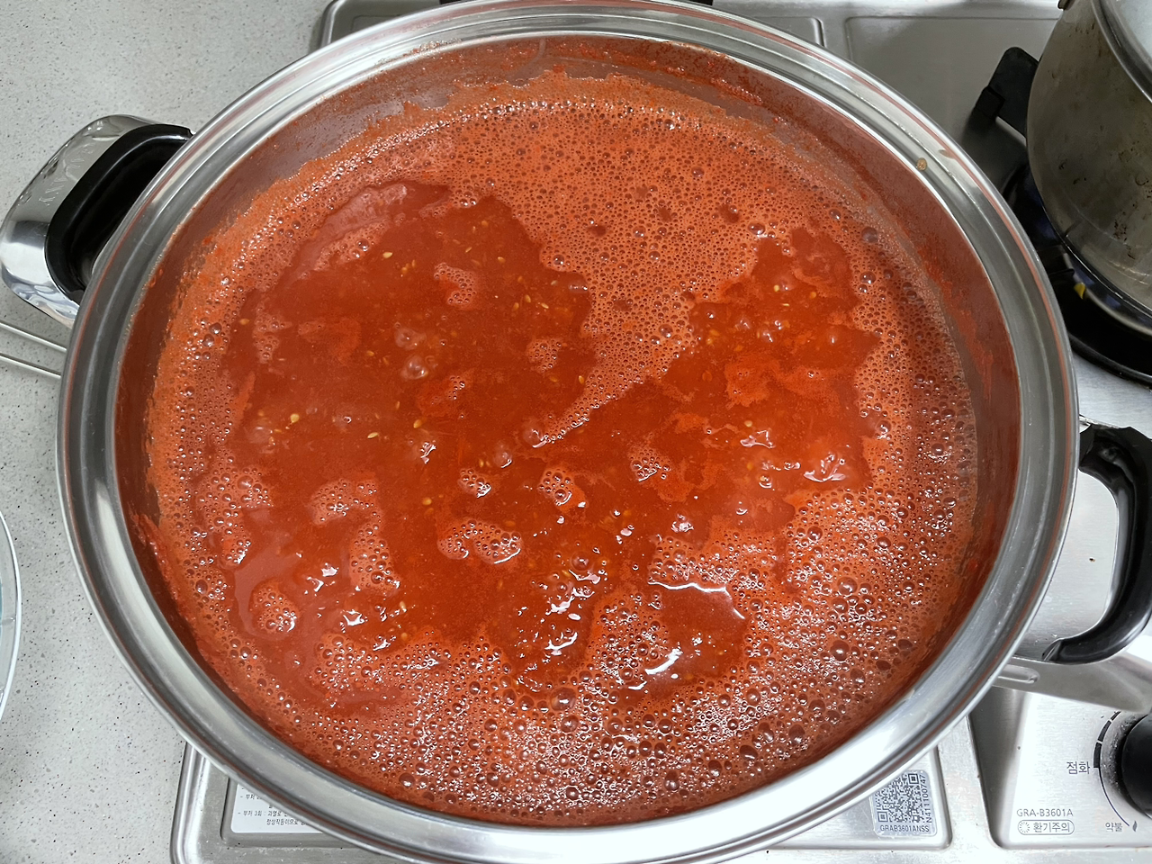 장마 중에도 사이사이 붉어가는 토마토를 따 왔다. 햇살이 없이 장대비를 맞는 토마토가 장하게도 매일매일 익고 있더라. 갈 때마다 붉어지는 것들을 몇 알씩 따와 통풍이 잘되는 대바구니에 담아 후숙을 시켰다. 모은 것들이 후숙을 넘어 과숙이 될 것 같아 오늘 드디어 두 번째 캔닝을 했다.