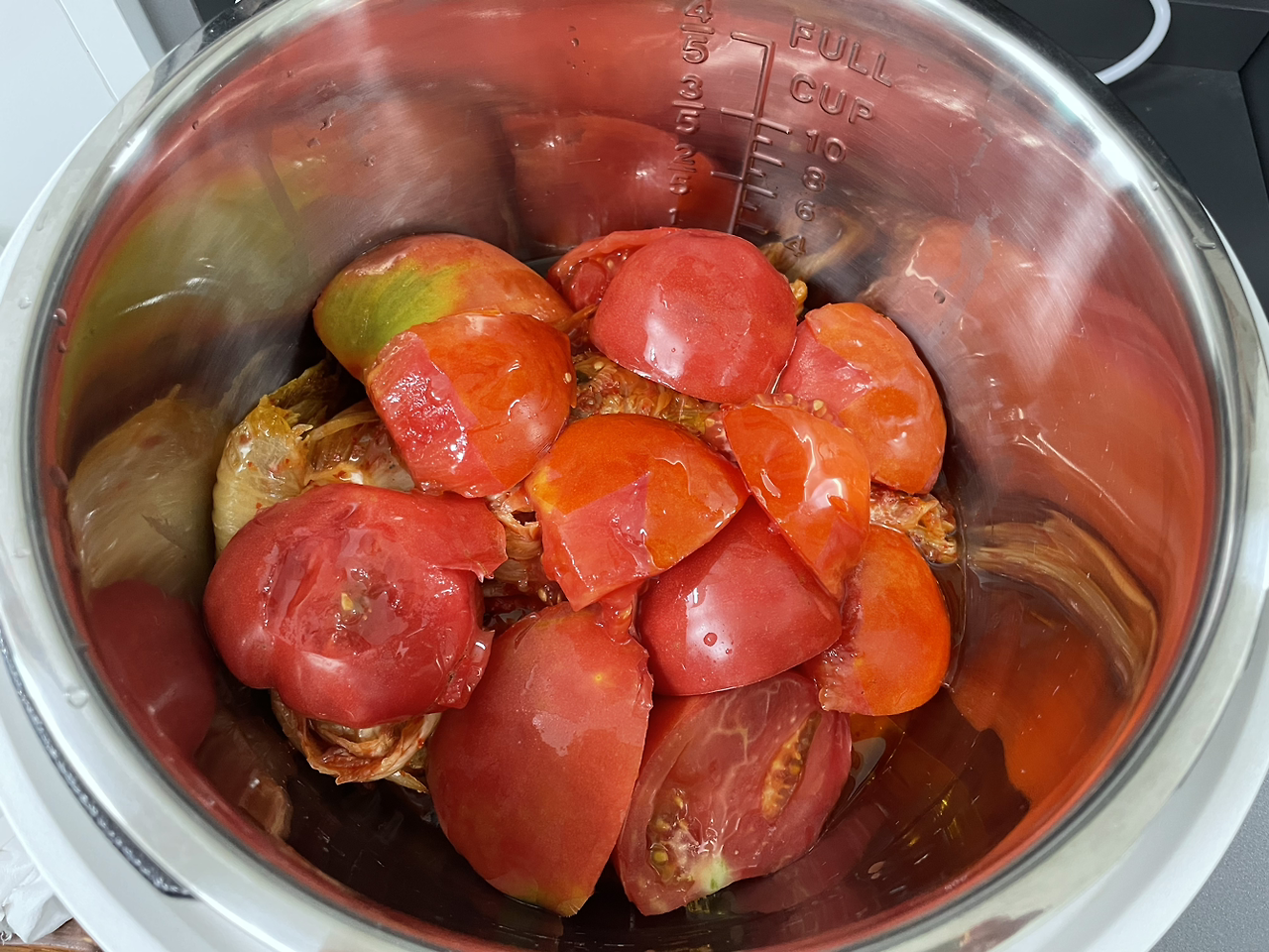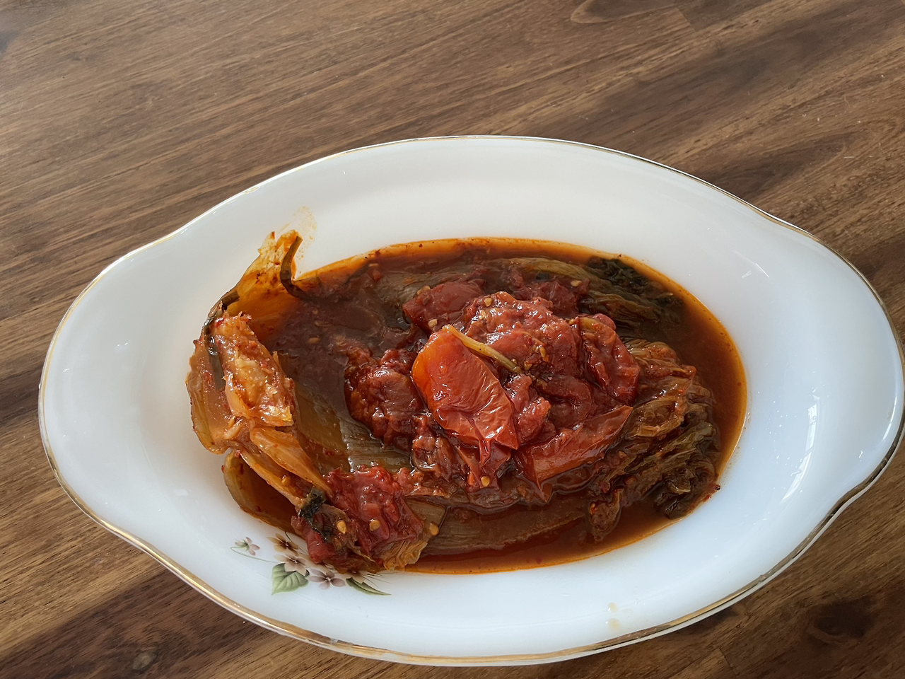 또 한 가지 시도해 본 것은 토마토 김치찜. 캘리포니아에서 텃밭 농사지으며 건강한 음식을 소개하는 <칼밥>이라는 유튜브에서 배운 요리인데, 무엇보다 간단하여 시도해 보았다. 재료는 묵은지, 토마토, 올리브유 단 세 가지, 결과는 대박! 김치찌개에 양념으로 넣어본 적은 있지만 토마토가 주가 된 건 처음이다. 고기 넣은 것보다 토마토의 풍미가 감칠맛을 더하여 깔끔하고 상큼한 맛이 더위에 떨어진 입맛을 돌아오게 할 반찬이라고 어떤 이에게 말해주고 싶다. 토마토 붉은색이 바랜 고춧가루를 대신하여 묵은지를 다시 붉게 단장한 빛깔이 먹음직스러워 보이기까지 하던데, 글쎄.. 캘리포니아 아줌마와 나의 입맛일까? 시골사람이라는 공통점은 있다.