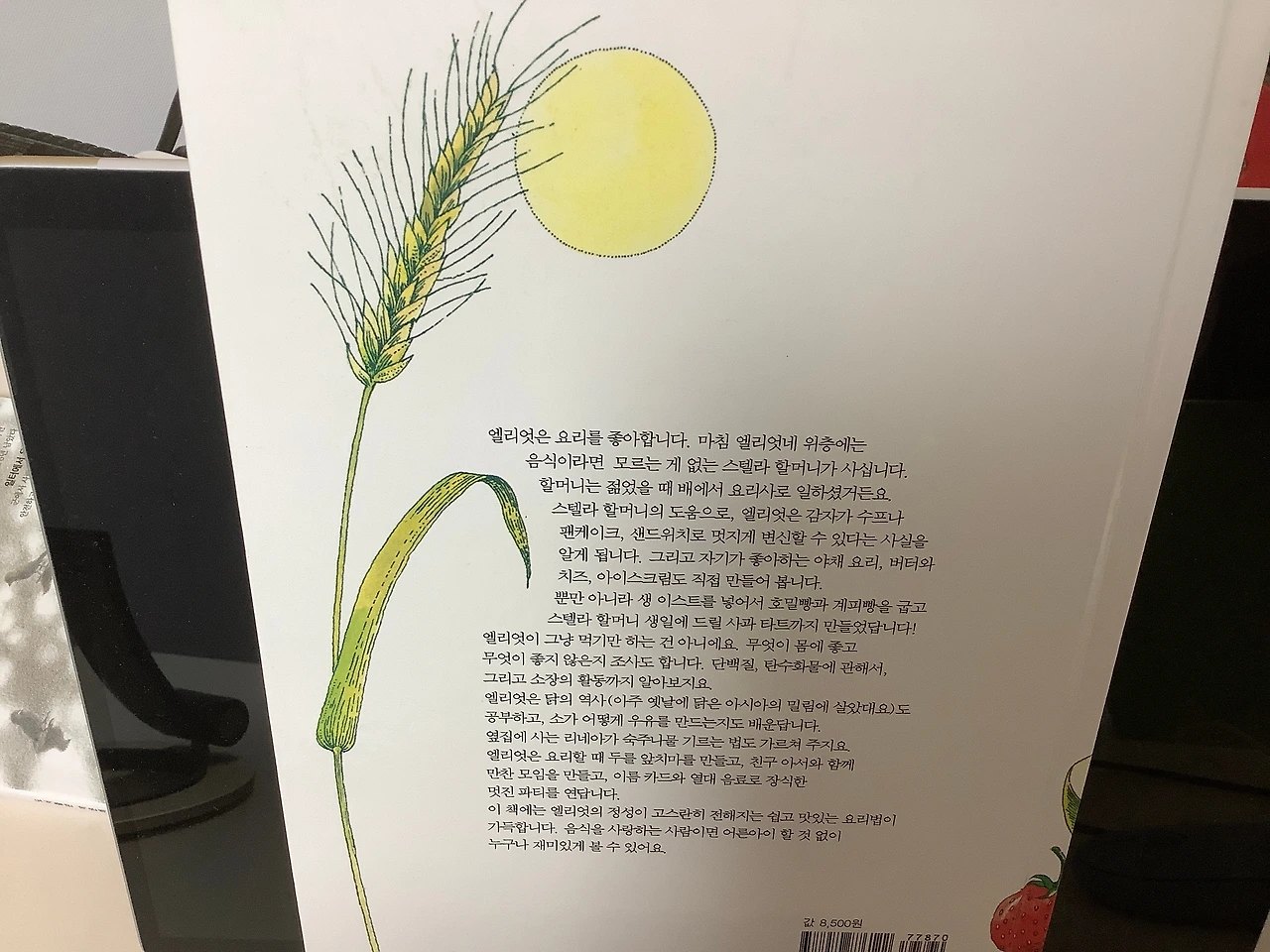 하드커버 표지 안쪽에까지 끝까지 열성을 다한 그림을 보면 글과 그림을 완성한 두 여성작가의 마음이 전해져 온다. 뒷면 표지 그림은 또 어떻고, 맥시멀 한 책 본문과 달리 매우 미니멀하다. 밀과 보름달 이라니, 밀은 알겠는데, 보름달의 의미는 무엇일까? 전 일류가 보름달처럼 넉넉한 식생활이 되기를 바라는 마음일까.