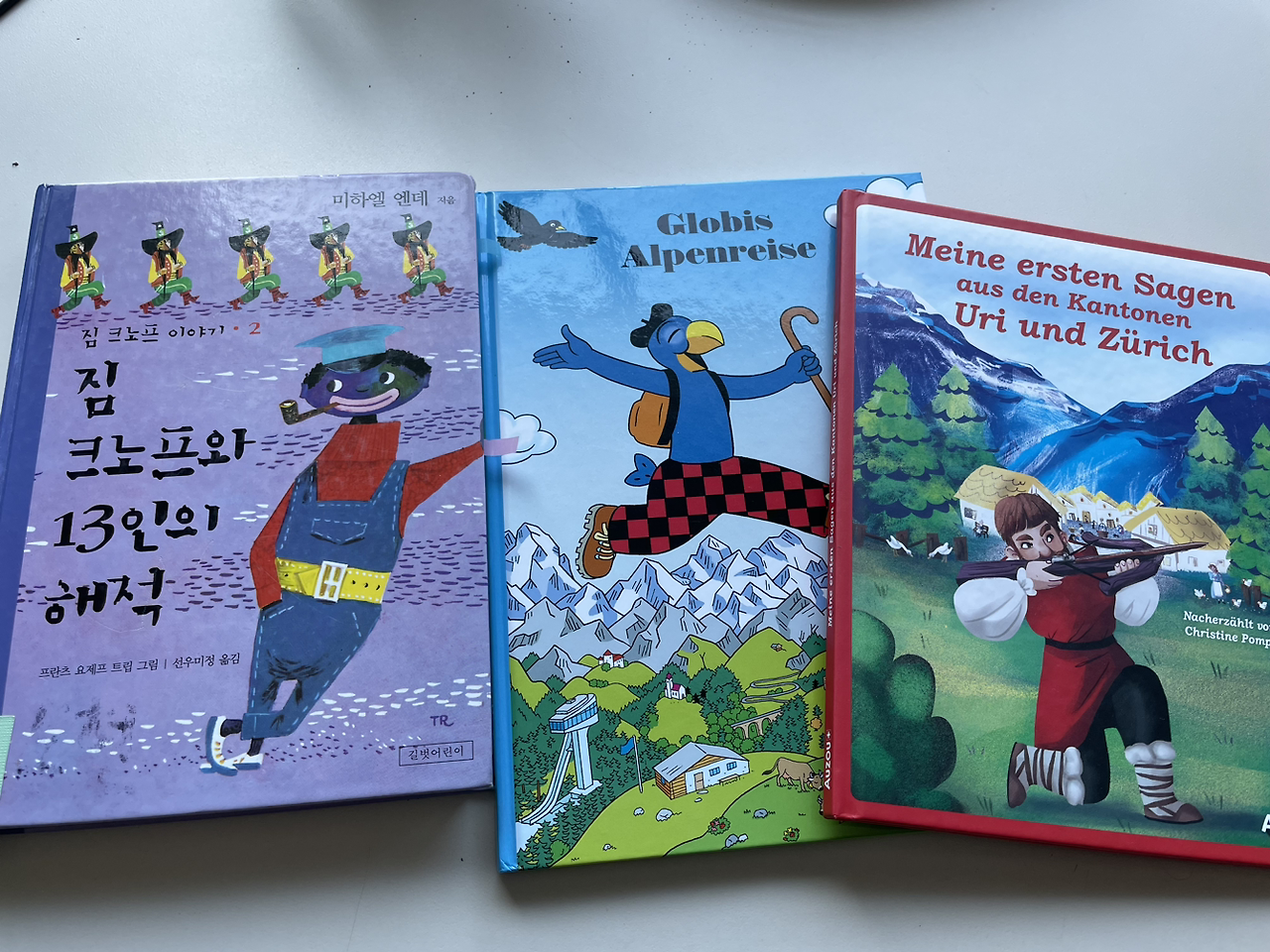 때론 부모의 마음으로 대부분은 이모(마누가 그렇게 불렀다)의 마음으로 그녀들과 함께 했지만, 셋이 친구가 된 시간은 책을 선물로 주고받으며 이야기를 나눈 때다. 도가 마누집을 방문할 때 내가 사준 한국 그림책을 선물해서 인지 그녀 역시 그림책을 선물로 가져왔다. 스위스에서 오랫동안 아이들에게 인기 있는 globis라는 캐릭터책과 세편의 이야기가 담긴 민담 설화(folk tale) 집이다. 알고 보니 '윌리엄 텔 사과'에서 윌리엄텔이 독일이 아닌 중세 스위스의 전설의 영웅, 명사수이자 사냥꾼이었다. 바넷사가 예비 그림책작가인 건 방 책장에 있던 그림책들에 환호하며 함빡 빠지는 걸 보고 알게 되었다. 당연 이탈리아 볼로냐 그림책 축제 이야기가 나왔고 둘 다 흥분하여 각각 글과 그림을 맡아 작품을 완성하여 함께 나가보자고 손바닥을 마주쳤다. 준비하지 않았던 내 선물도 자연스레 정해졌다. 책장에 있는 책 중 마음껏 골라가기! 바넷사는 세밀하고 아기자기한 그림이 일품인 <산토끼 가족의 이사>를 골랐고, 마누는 미하일 엔데 작 <짐 크노프와 13인의 해적>을 골랐으나.. 가고 나서 보니 책장에 그대로 꽂혀 있다. 어릴 때 재밌게 읽은 책이 한국말로 되어있는 게 무척 신기하다고 해서 한국어 공부하기 좋을 것 같아 가져가라 한 건데 너무 오지랖이었나?