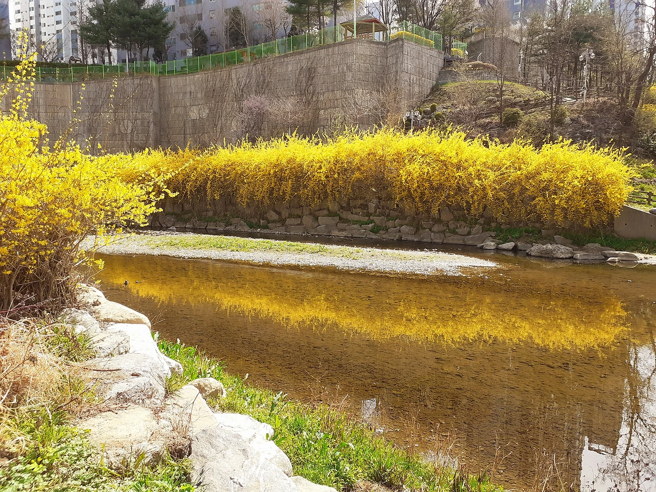 조금 숨이 찰 정도의 능선을 올랐다 내려갔다 서너 번 반복하다 보면 벌써 끝자락, 아쉬워 근처 아파트 산책길을 따라 한강 쪽으로 더 걷는다. 오솔길을 따라 걷다 보면 짜잔~ 한강이 굽어 보이는 지점에 이른다. 확 트인 풍경에 요즘 더해진 건 지천에 핀 개나리 동산이다.