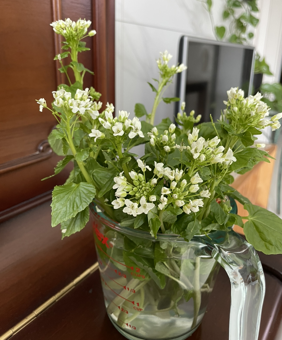 기대하지 않은 고추냉이꽃이 살아났다. 화려하진 않아도 다닥다닥 붙은 작은 꽃잎에서 봄을 만났다. 잠시 멈칫했지만 끝까지 꽃을 피워낸 은근한 생명력, 그래 봄이니까!
