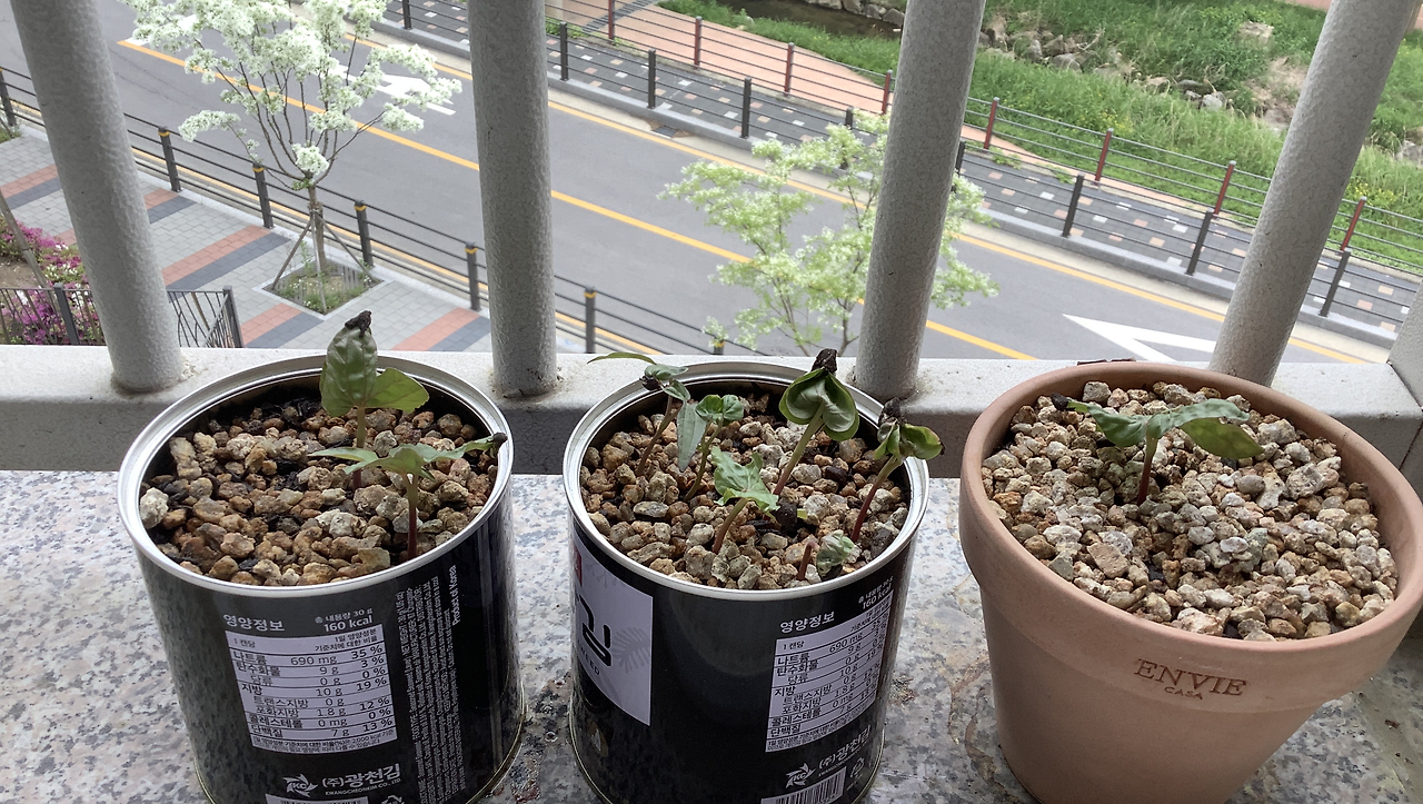 아침에만 피었다 지는 나팔꽃 시간을 놓치지 않기 위해 마루 창가에 쪼르르 놨다. 새싹의 기세와 크기가 만만찮다. 혹시 잭의 콩나무처럼은 아닐지라도 난간 살을 넘을 정도로 덩굴이 뻗치는 게 아닐까? 대비해 그물망도 준비해 놨다.