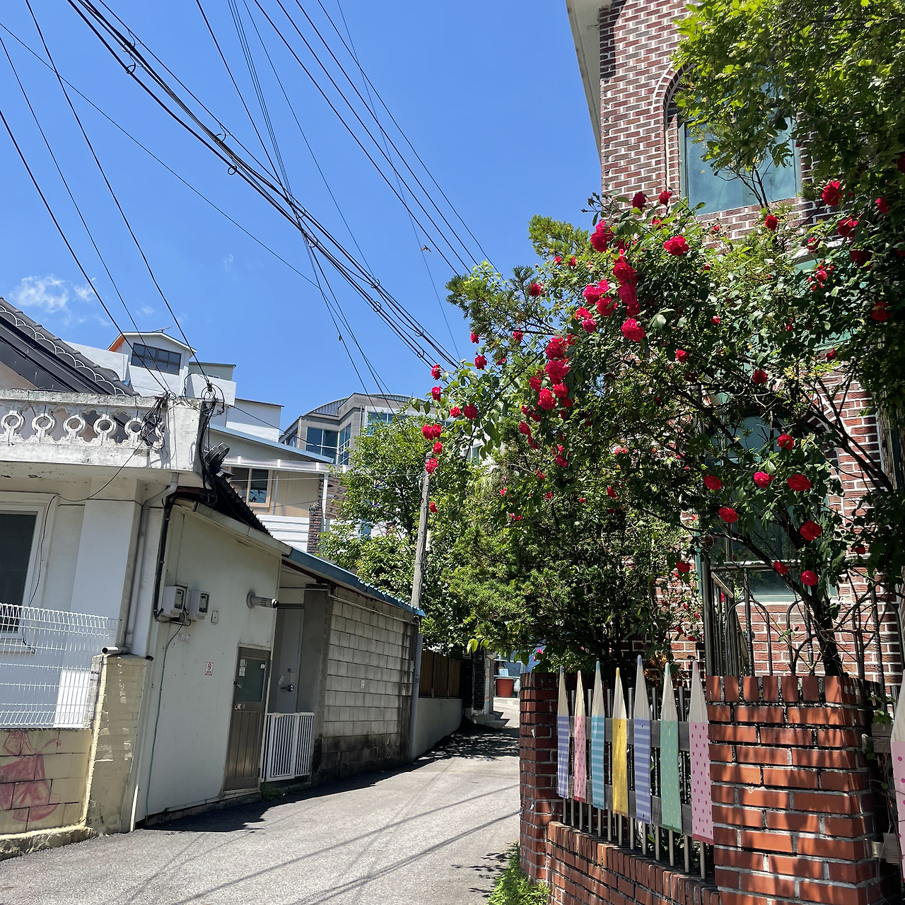 기울어진 유치원 장미들이 레트로풍 골목을 들뜨게 한다.