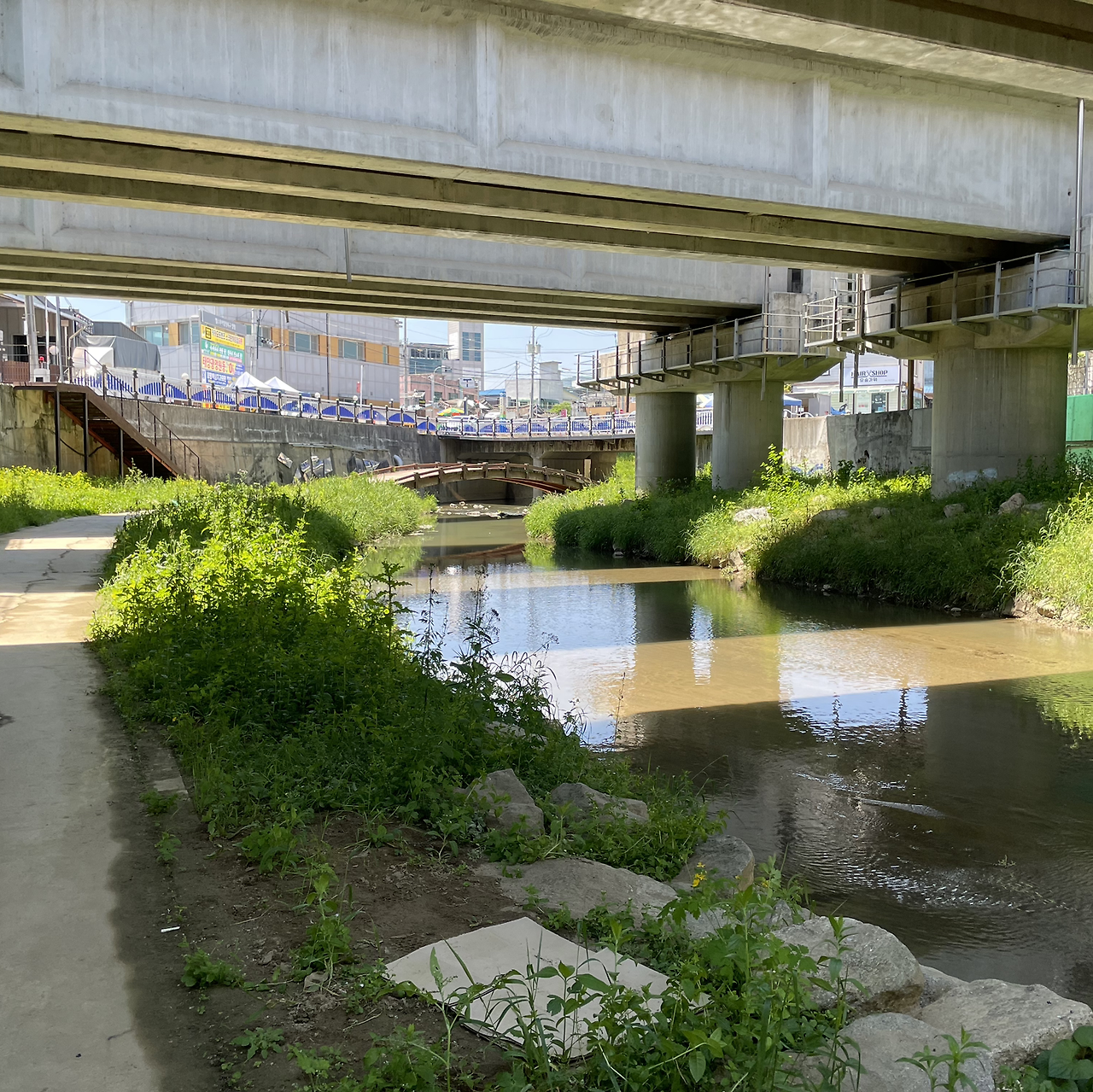 다리밑의 다리, 물그림자, 물풀, 멀리서 보면 렌즈 안 세상 같다.