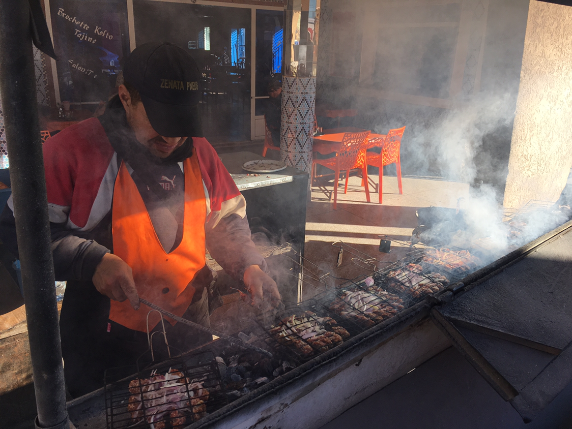 Morocco 에서 꼭 맛봐야 하는 음식은 전통요리인 따진이나 꾸스코스 이다. 그러나 까다로운 내 입맛에는 별로였고 친구와 내가 가장 좋아한 것은 염소 갈비 바베큐 이다. 장거리 버스를 타고 이동하다 보면 점심식사 시간에 휴게소에서 20분 이상을 꼭 쉬어간다. 운전사가 식사하는 시간이다. 휴게소에는 염소 몇 마리가 정육점처럼 걸려 있다. 고기를 먹기좋게 잘라달라고 주문하면 바로 앞에서 숯불로 구워준다. 바로 구운 염소 갈비와 빵과 차를 마시는데 딱 20분 걸린다. 장거리버스를 타는 즐거움을 배가시킨다. 정육바베큐휴게소가 기다려진다.