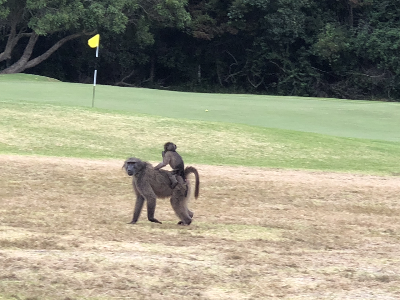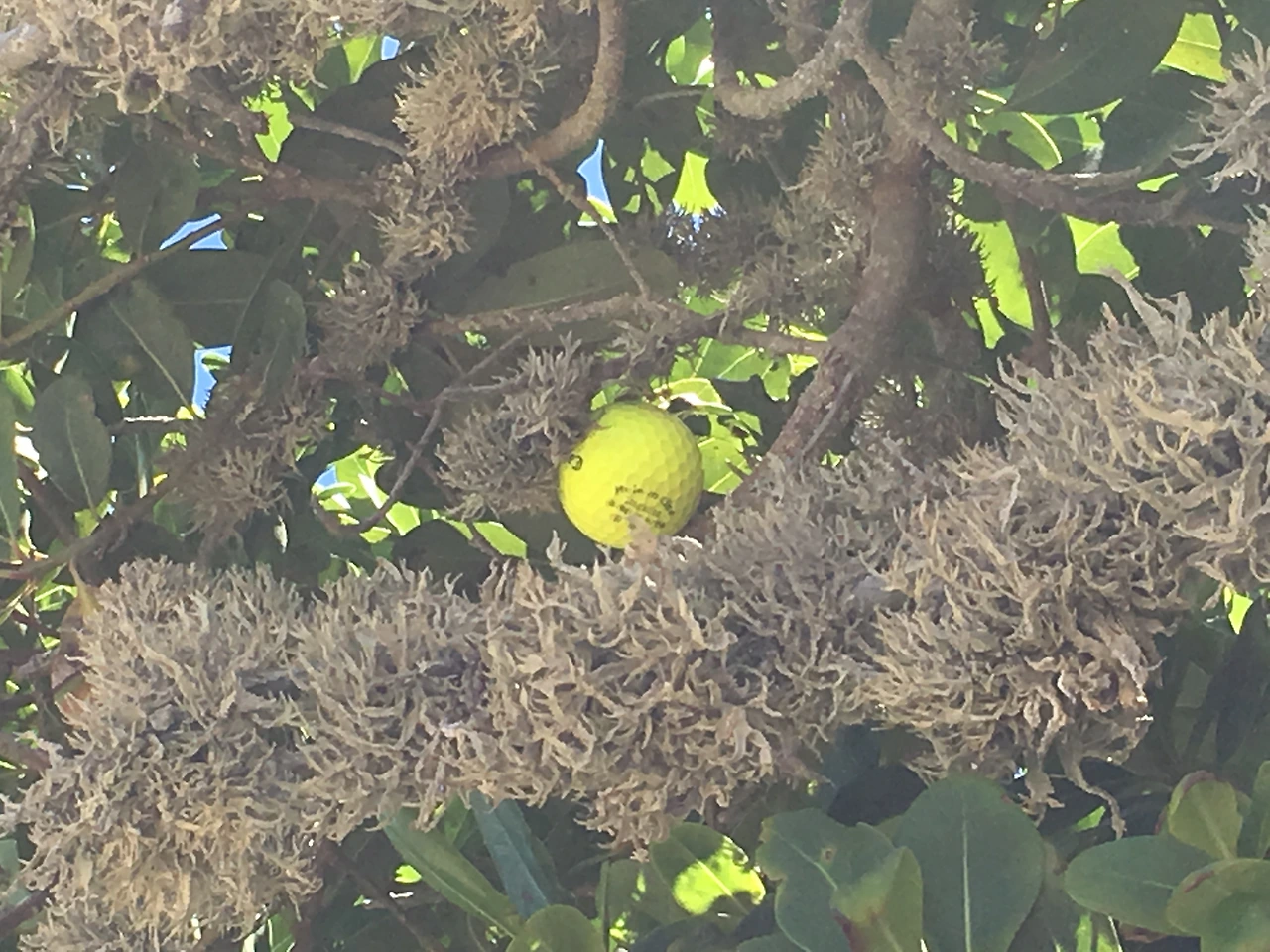 근처에 Hermanus golf club과 Arabella country estate golf course 가 있으나 비싼 데다 일정이 맞는 시간대도 없어 'Southernmost golf course in Africa'라는 이 곳을 들렀다. 9홀 코스이다. 멀리 바다가 살짝 내려다 보이는 소위 Links golf course이다. 인구가 얼마 안 되는 Gansbaai의 동네 할아버지 놀이터이다. 파 5 홀에서 드라이버를 괜찮게 쳤다. 두 번째 샷을 하려는데 60 미터 앞의 나무가 시야를 좀 가린다. 나무를 넘겨 치겠다고 스푼을 잡지 않고 유틸리티를 들었다. 그러나 탄도가 낮아 우려한 대로 나무 방향으로 공이 날아간다. ‘골프공은 꼭 우려한 대로 날아간다.’ 무성한 나뭇잎 사이로 노란 공이 날다가 떨어지는 것을 보았다. 그런데 아무리 앞뒤를 찾아도 공이 없다. 왔다 갔다 하며 한참을 찾다가 위를 보니 공이 나무 가지 사이에 앉아 있다. 내 골프 30년 역사에서 이런 경우 처음이다.