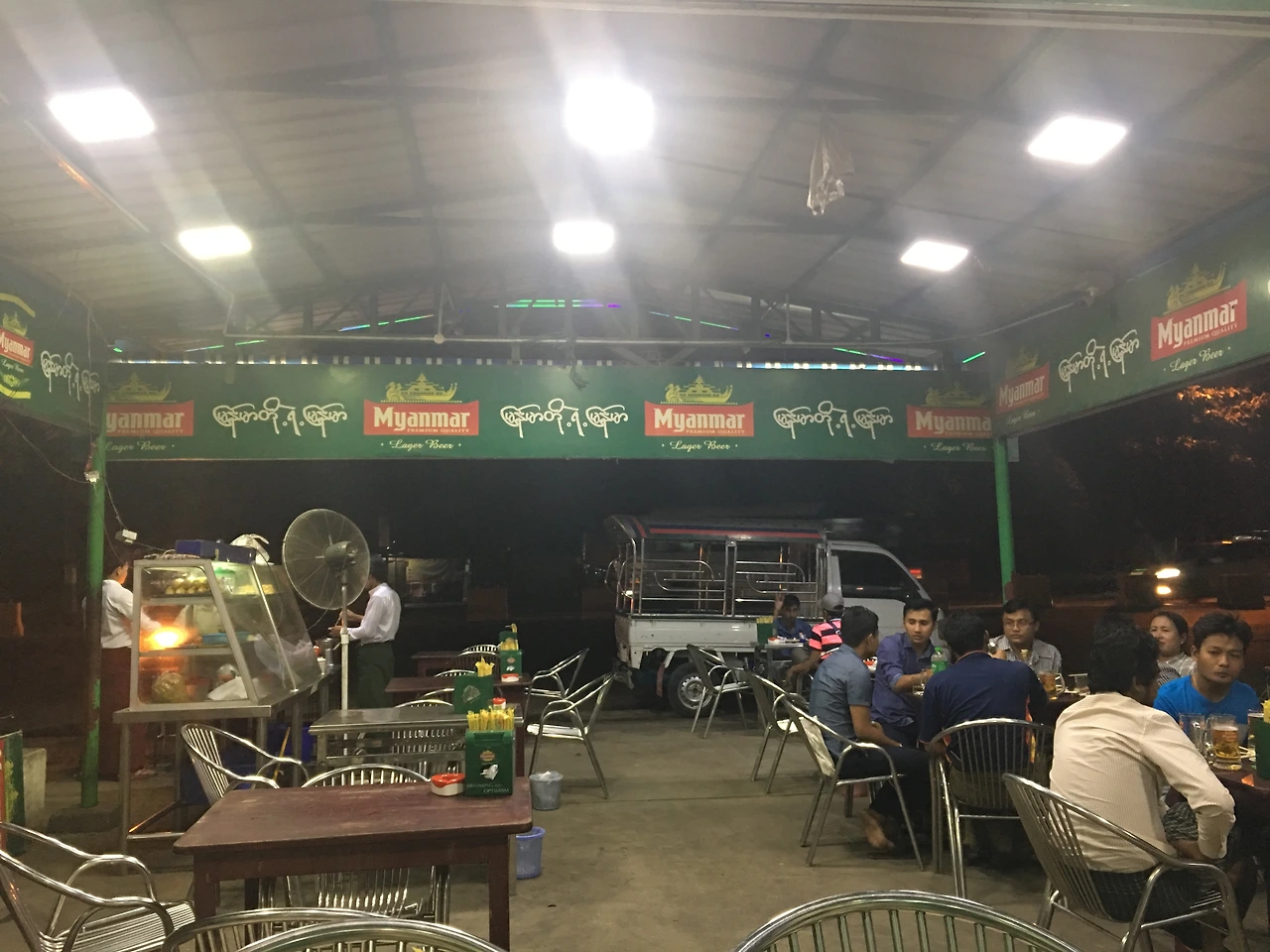 저녁을 호텔 바로 옆의 식당에서 미얀마 사람들 속에서 혼자 했다. 변변한 메뉴판조차 없는 대로변 식당이라 주문에도 어려움이 있다. 꼬치를 굽고 있어 삼겹살과 메추리알을 시켰다. 맥주와 볶음면도 시켰다. 테이블마다 생맥주잔이 한가득이고 바로 옆 테이블의 세 중년남들은 발렌타인 위스키도 병째로 놓고 마시고 있다. 나 같은 이방인이 있으면 관심 가질 만 한데 전혀 눈길도 주지 않는다. 그들이 나의 존재를 전혀 어색해하지 않는다. 오히려 다행이다. 내가 편하다. 오직 젊은 아니 어린 웨이터들만 내 주변을 맴돌고 있다.