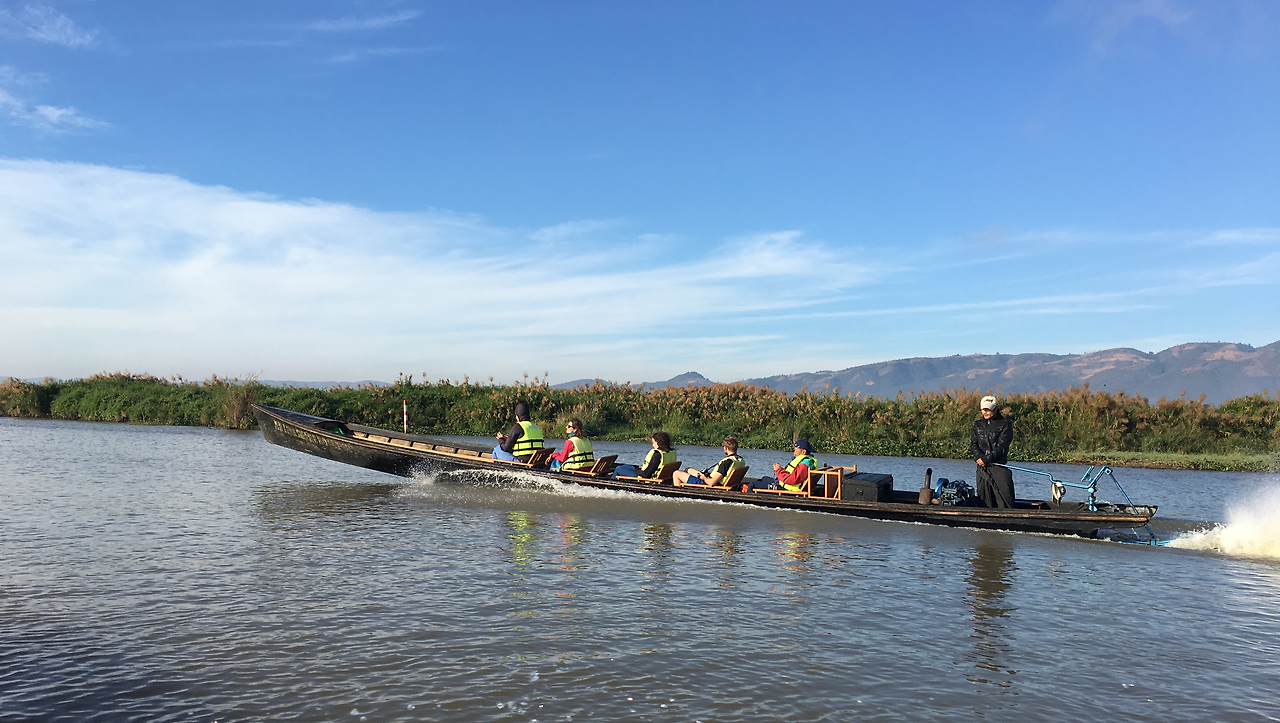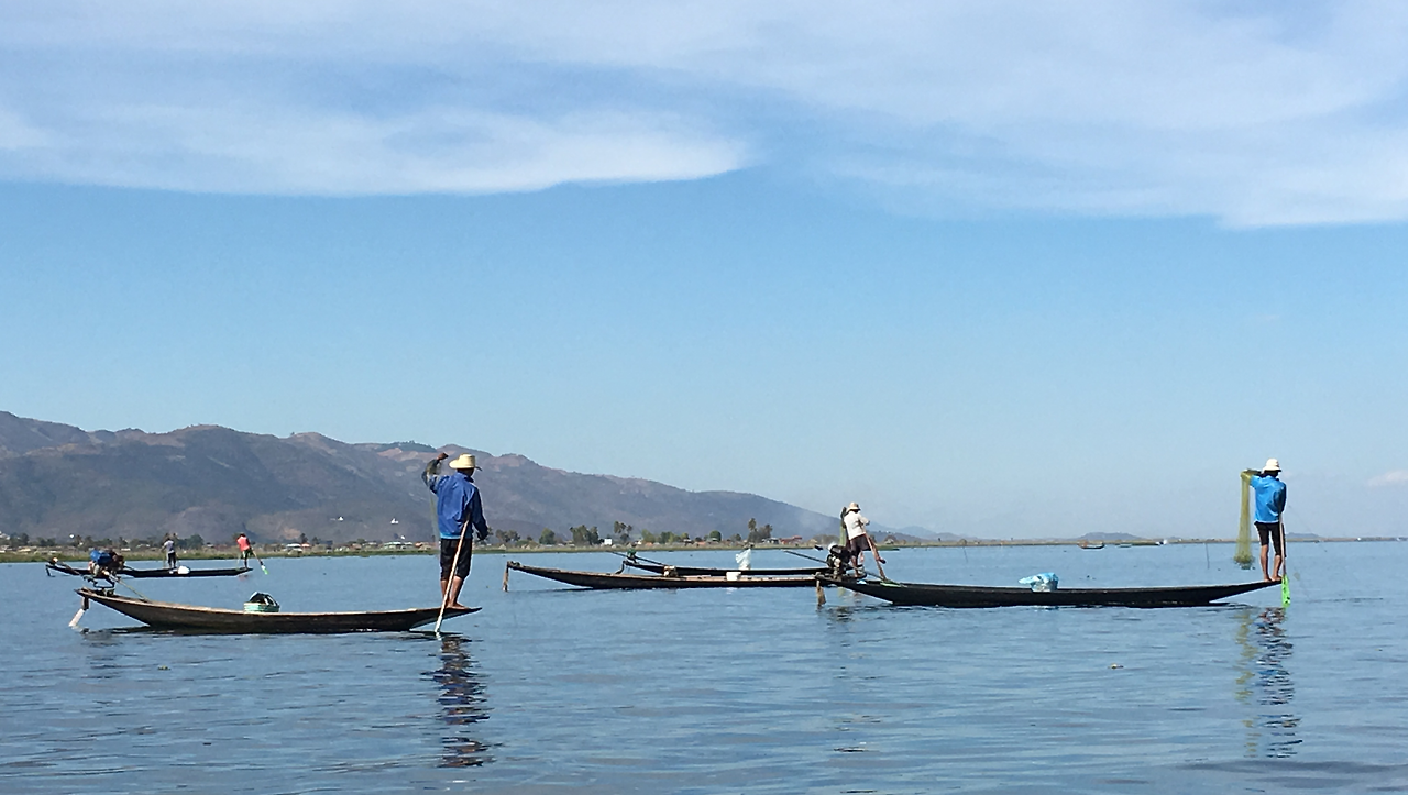 날렵하게 긴 보트에 작은 디젤엔진이(손으로 돌려서 시동을 건다) 있고 보통 관광객 5명을 태운다.(간혹 성인 여섯까지는 탄다.) 우리 그룹 열 명은 두 대의 보트에 나뉘어 승선했다. 낭쉐 다리 밑에서 탄 보트는 아침 안개를 가르며 정확하게 8시에 출발했다. 5 킬로 정도의 좁은 수로를 지나가자 드디어 넓은 인레 호수에 나왔다. 제법 길고 큰 호수다. 끝이 잘 보이지 않는다. 아침 조업 중인 어부들이 많다. 우리가 탄 보트는 엔진이 달리고 성인 대여섯을 태울 수 있지만 어부들의 낚싯배는 작은 엔진이 달린 것도 있고 없는 것도 있다. 잘해야 한 두 명 타겠다. 통나무를 이쁘게 깎은 낚싯배들은 어부가 서서 작업을 한다. 서서 한 발로 노를 젓고 한 발로 서서 손으로 그물을 내리거나 어구를 던진다. 관광객이 가까이 가면 사진 찍으라고 자세를 취하는데 제법 우아한 동작과 포즈를 취한다.