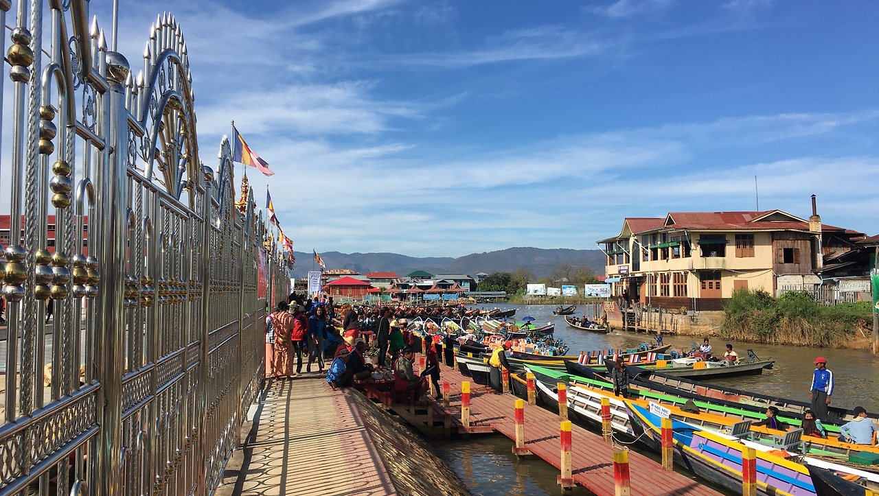 낭쉐는 인레호수 관광의 중심 마을이다. 여기서 호텔 3박을 하니(이즈음은 한 곳에 3박이 기본 여행 스타일) 하루는 관광을 해야 한다는 의무감이 생긴다. 호수 주변 트레킹이나 호수를 보트 트립이 하는 것이 주로 하는 관광인데, 트레킹은 흥미 없고 보트나 타야겠다. 보트 트립 파는 곳이 무지하게 많다. 호텔 로비에서도 파는데 보트 하나를 종일 빌리는데 우리 돈 2 만원도 안된다. 자전거로 낭쉐를 둘러보다가 ‘Share boat trip’ 이란 광고 현수막을 보았다. 일인당 우리 돈 4,500 원이고 호텔 픽업 서비스도 한다는. 현수막을 사진 찍어 호텔 프런트 아가씨에게 예약을 부탁했다. 아침 7:30에 픽업 온단다.