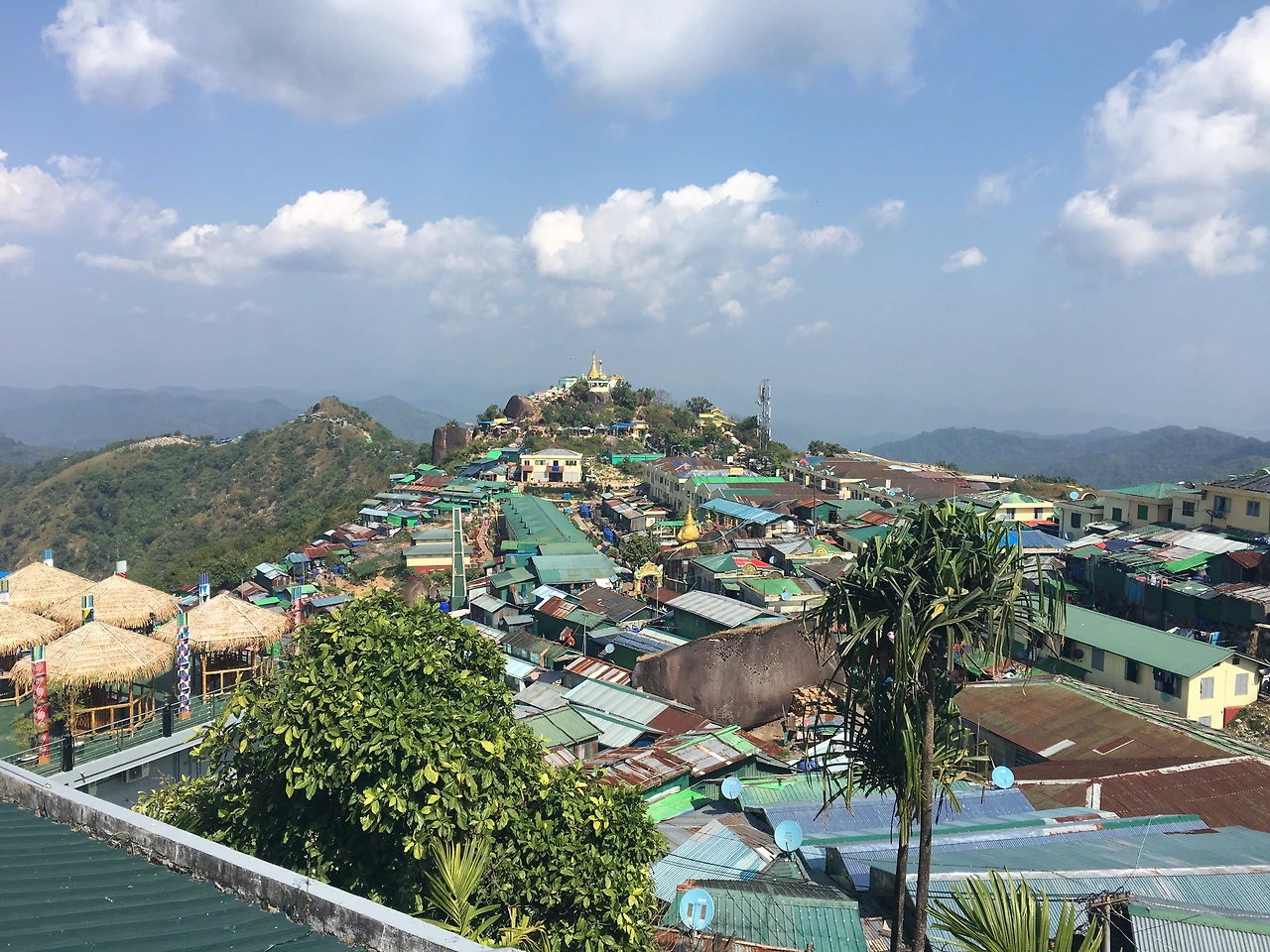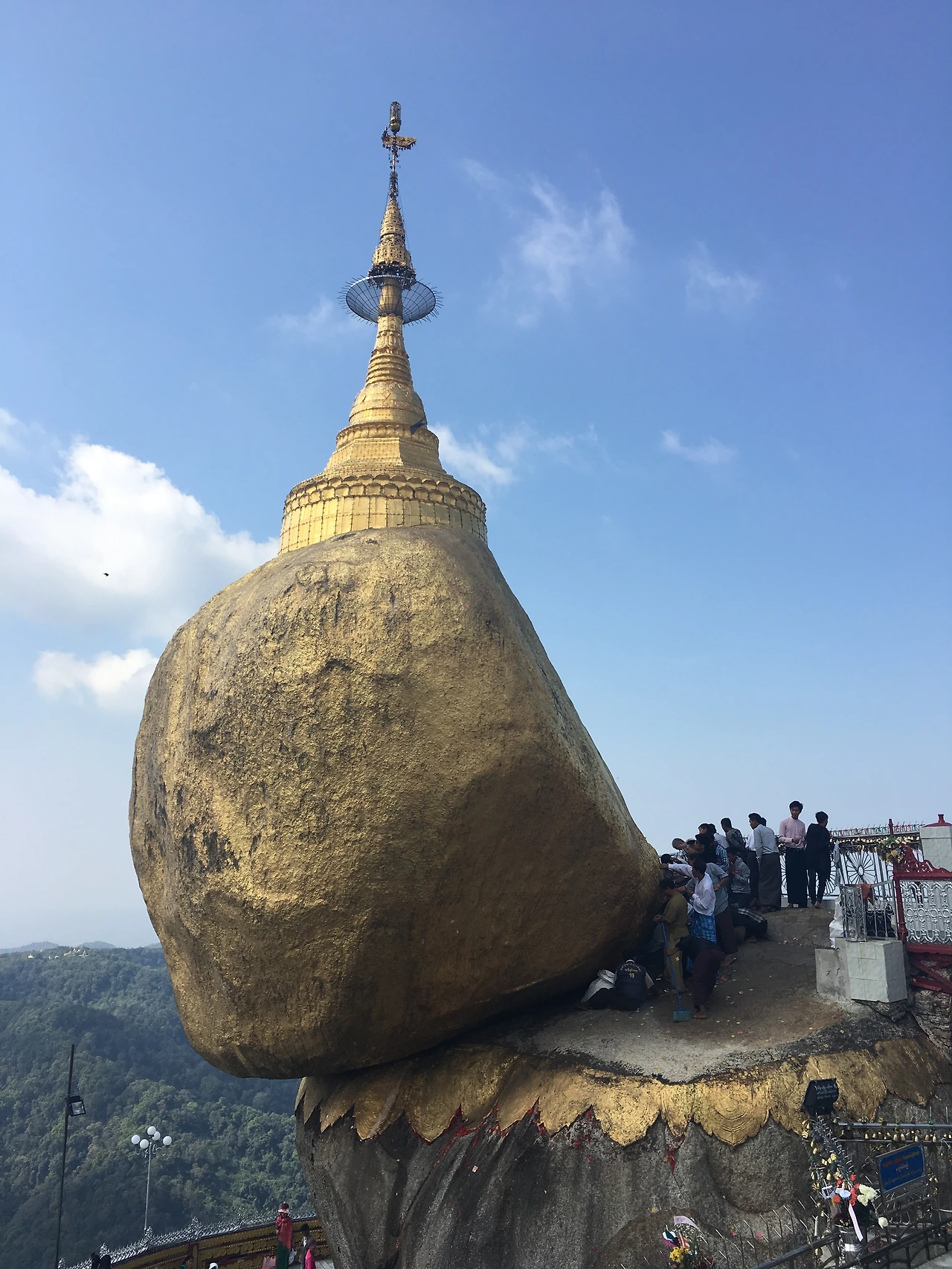 Golden Rock 은 산 정상에(해발 1400미터) 있다. 엄청나게 많은 사람들이 정상에 있다. 정상 부근에 제법 큰 마을이 형성되어 있다. 시장도 있고 호텔이나 음식점도 많다. 많은 사람들이 정상 광장에서 하루나 이틀을 노숙하면서 일출과 석양을 보며 부처님께 소원을 빈단다. 다음 생에는 부잣집에 태어나기를 빌지도 모르겠다. 흔들바위 같이 위험하게 서 있는 큰 바위는 전체를 금칠을 해 놓았고 접근이 용이한 뒤쪽에는 사람들이 금박을 돌에 붙이며 비싼 소원을 빌고 있다. 부처님이 금을 좋아하나 보다. 그 많은 파고다와 불상도 금칠이나 금박을 입히는 것을 보니...