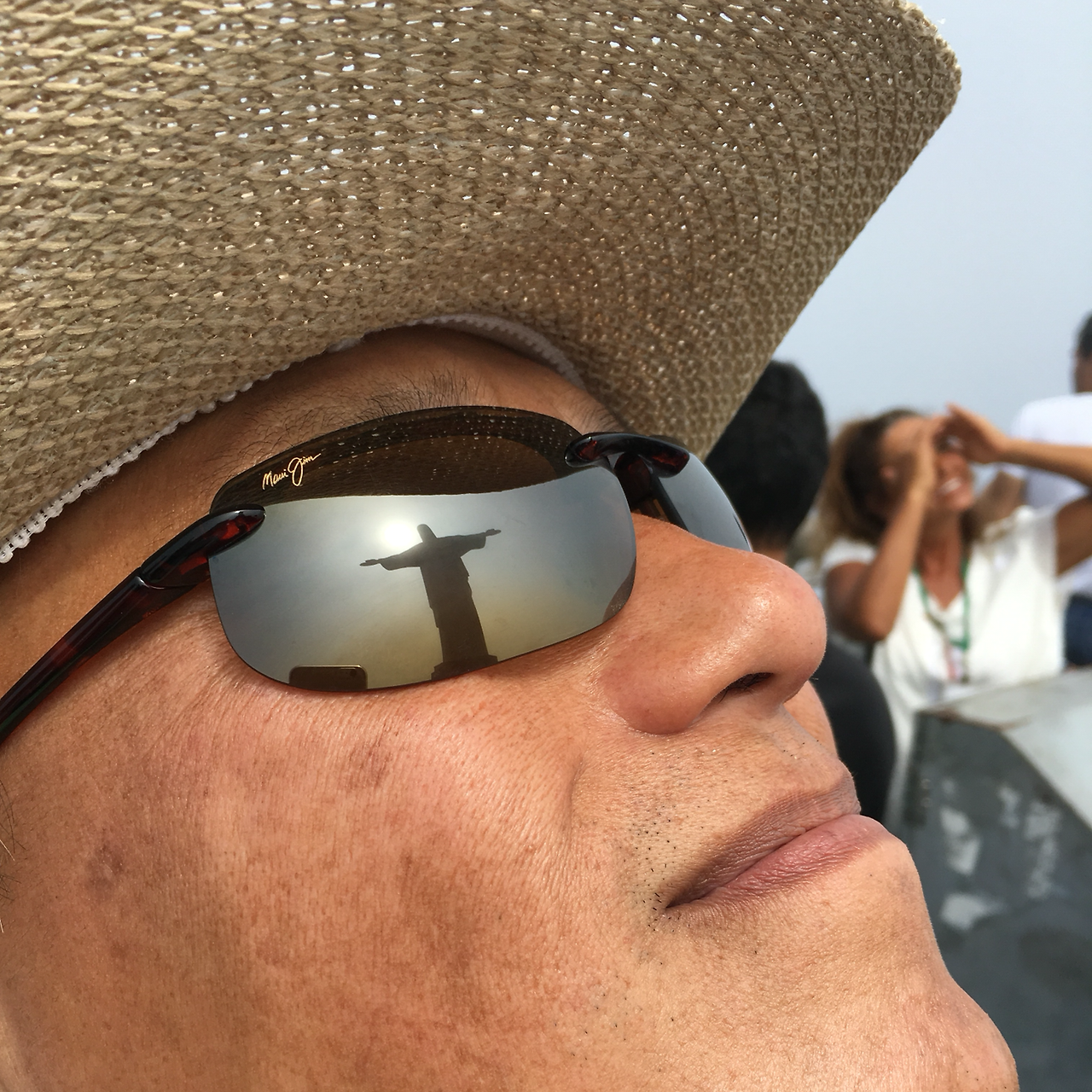 오전인데도 많은 사람들로 코루코바두산 정상은 붐비고 있었다. 구름에 가려서 예수님의 얼굴도 산 아래 리우의 모습도 잘 보이지 않는다. 어쩌겠냐며 이리저리 구름에 가린 풍경과 예수상을 찍고 있는데 햇빛이 느껴졌다. 구름이 걷힌 예수님의 모습이 눈에 들어왔다. 우리를 안내하던 가이드 산토스가 아이폰을 달라하더니 선그라스에 반사된 예수상을 찍는다. 여기서 꼭 찍어야 하는 사진이라며...