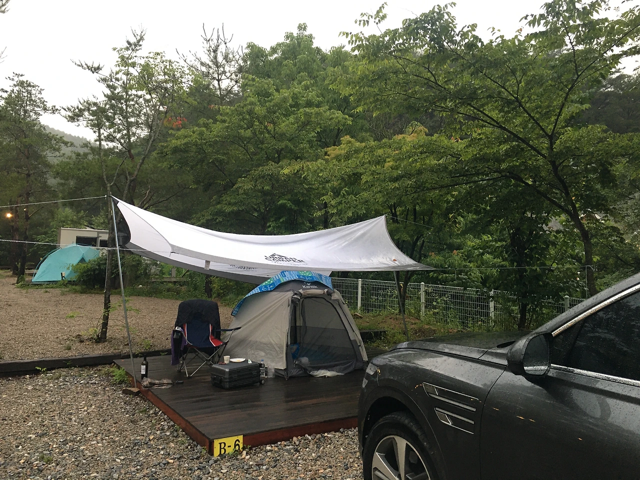토요일 밤에는 비가 엄청 내렸다. 딸네 가족은 SUV에서 차박을 하고 나는 혼자 텐트에서 자기로 했다.