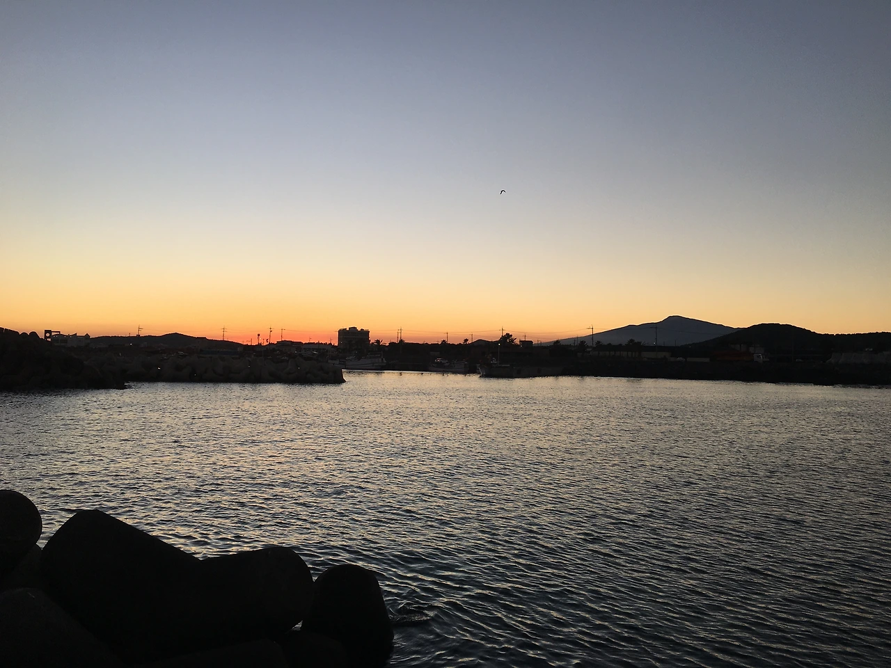 이튿날 나는 아침에 일어났다. 사과 하나 먹고, 자고 있는 아들이 깨지 않게 조심스럽게 원룸을 나왔다. 성산 일출봉을 향해 시로코를 운전하기 시작했다. 오랜만에 듣는 시로코 디젤엔진 소리가 저속에선 심히 거슬린다. 일출봉을 오를 마음은 애초에 없었고, 식산봉도 잘 보이는 장소에서 커피를 마시고 싶었다. 날씨가 좋아 경관이 그만이다. 살짝 정상에 눈 덮인 한라산도 선명하게 보인다. 성산에서 해안도로를 따라 표선으로 향했다. 하늘의 구름이 정말 예쁜 날이다. 거의 파도가 없어 바다는 장판 같고, 간간이 어선들이 떠있다. 평일이라 그런지 올레길 걷는 사람도 거의 없다. 겨울 바다의 무섭게 파란색에 섬뜩함이 느껴졌다. 난 물이 무섭다. 표선에 거의 다다른 정오 무렵 아들로부터 전화가 왔다. 어디 있냐고? 자기 깼으니 픽업하란다. 점심으로 해물라면을 함께 먹었다. 그리고 성산 일출봉과 섭지코지가 잘 보이는 물썹 카페에서 커피도 마셨다. 숙소로 가잔다. 자기는 오늘 날씨가 좋아 짬낚(짬 내어하는 낚시) 해야겠단다. 일몰까지 두 시간 정도 할 수 있단다. 숙소에서 장비를 챙긴 아들을 신천리 방파제에 내려주고 나는 근처 오름(영주산)을 올랐다. 해발 326 미터의 오름 정상에서 근사한 경치를 보고 서둘러 아들이 낚시하고 있는 방파제로 돌아왔다. 일몰이 다가오고 있었다. 서쪽 하늘이 핑크빛으로 붉게 물들어 가고 있다. 아들은 저녁노을을 보며 마지막 낚싯대를 던지고 있다.