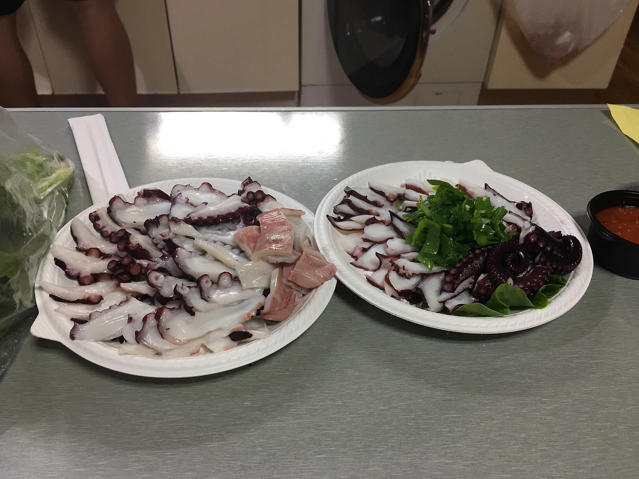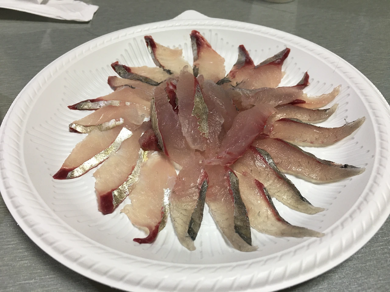 떡밥과 미끼를 엄청 뿌려 제법 큰 전갱이 한 마리를 잡았다. 잡어들 몇 마리는 그냥 놓아주었단다. 숙소로 돌아온 아들은 전갱이를 손질하기 시작했다. 이제 생선을 다루는데 거의 도통한 듯 보인다. 한 접시의 전갱이 회를 놓고 소주를 각 일병 했다. 식사는 짜장면을 배달시켜 해결하고....