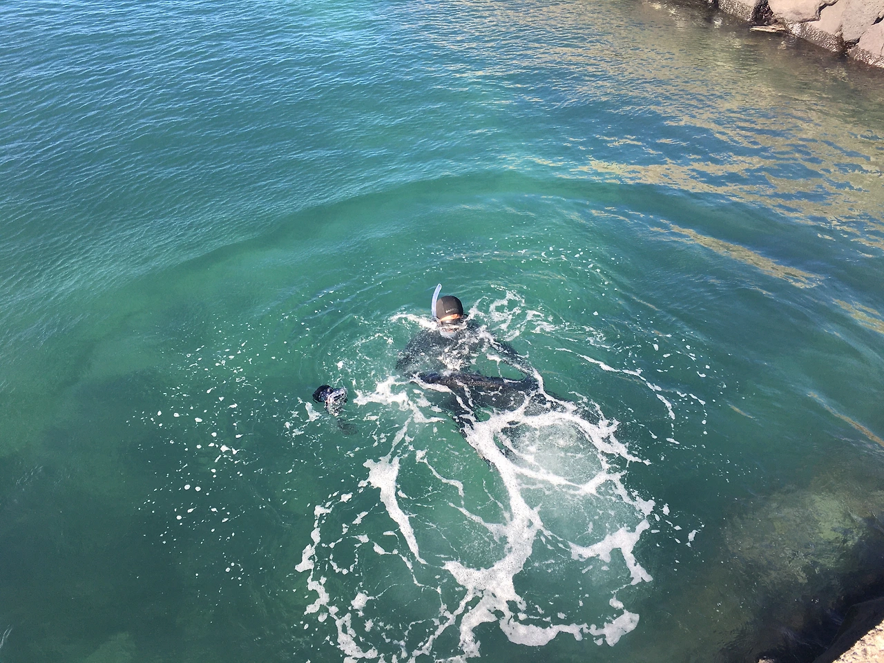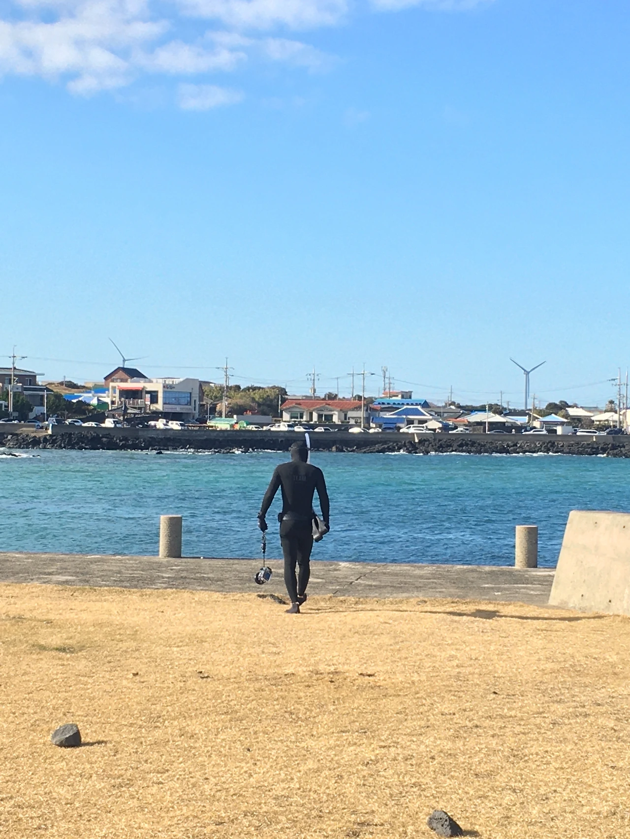 정오가 넘어 아들이 전화했다. 어디 있냐고? 픽업하란다. 잠수할 때 입는 슈트랑 장비를 챙겨 기다리고 있다. 오늘은 물에 들어가신단다. 성산 일출봉 근처 별다방에서 커피와 샌드위치 픽업하고 평대 해변으로 가잔다. 평대 해변 한적한 정자에서 잠수 슈트 차려입고 오리발, 수중카메라 들고 바다를 향해 간다.