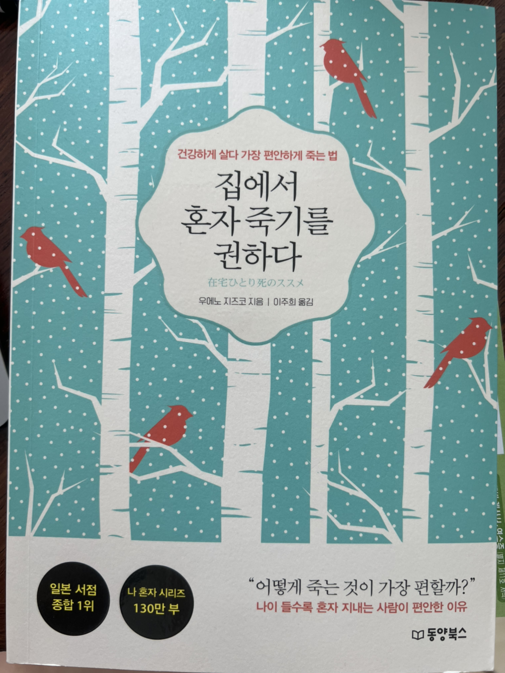 건강하게 살다 가장 편안하게 죽는 법, 어떻게 죽는 것이 가장 편할까? 나이 들수록 혼자 지내는 사람이 편안한 이유, 혼자 죽는 건 의외로 괜찮다!, 내가 좋아하는 집에서 안락한 최후를 맞이하는 방법 등이 책 앞 뒷장에 쓰여있는 문장들이다. 어쩌면 내 꿈 '요양원이나 요양병원 가지 않고 생을 마감하기'를 이룰 방법론이 이 책에 있을지 모른다는 생각이 들었다.