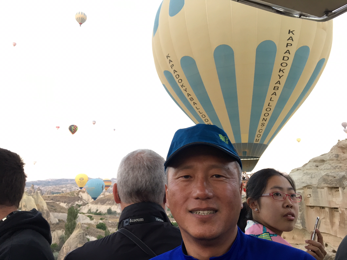 풍선의 basket 에 올라타자 이륙하기 전에 pilot 뷰랄이 두가지 주의사항을 알려준다. 첫번째는 "Do not jump out from the basket." 사방에서 웃음이 터져 나온다. 두번째는 비상착륙시의 basket 의 착륙방향과 자세에 대한 것이다. 열기구에 비상착륙이 있고 둥근 풍선에 앞뒤가 있다는 것을 처음 알았다. 바로 이륙을 시작한다. 주변의 여기저기서 앞서거니 뒤서거니 하며 아직 해가 뜨지않아 어스름한 새벽하늘로 열기구들이 'kissing' 하며 떠오른다. 풍선의 옆면이 서로 부딪히는 것을 kissing 이라고 한다. 산 위에 이미 떠오른 풍선들이 보이고 우리 풍선도 천천히 카파도키아의 스머프들의 집 같다는 봉우리들을 스칠듯 지나면서 떠오른다. 이 순간이 짜릿했다. 나중에 7000피트 상공까지 올랐을 때는 땅위의 지형들이 조그맣게 보여 비행기 이착륙시에 보는듯한 풍경과 사실 유사했다. 이 풍선이 얼마냐고 물어봤다. 10만 유로정도 한단다. 얼마나 오래 pilot 했냐고 물었다. 18살부터 열기구 관련 일을 했고 지금 31살이니 13년 정도 했단다. 경비행기 조종면허도 있고 패러글라이딩 단독비행면허도 있단다. 패러글라이딩 회사를 차리는 것이 꿈이란다. 16살부터 꿈꿨단다. 속으로 참 어릴 때부터 꿈꿨네 했다. 하긴 난 그 나이에 독립하겠다는 꿈을 꿨구 우리나라에서 제일 좋은 대학가는 것이 내 꿈을 빨리 이룰수 있는 길이라 생각하고 이 악물고 공부만 했는데... 하늘에서 충분한 시간을 보낸 것 같아 이제는 내렸으면 하는 생각이 든다. 소변욕구도 느껴진다. 드디어 착륙지점을 찾는 것 같다. 이미 지상에는 여러대의 풍선들이 착륙하여 풍선이 쭈그러 드는 것이 보인다. 우리는 우치사르 상공을 낮게 지나간다. 착륙지점을 찾느라 pilot 뷰랄이 긴장하는 것이 느껴진다. 뷰랄은 지상팀과 무전연락하느라 바쁘다. 주택가의 지붕을 낮게 지나간다. 아마도 이 집들이 끝나는 곳에 착륙할 생각인 것 같다. 착륙할 때는 나도 긴장되었다. 착륙하고 간단한 샴페인파티를 하고 시계를 보니 이제 7시다.