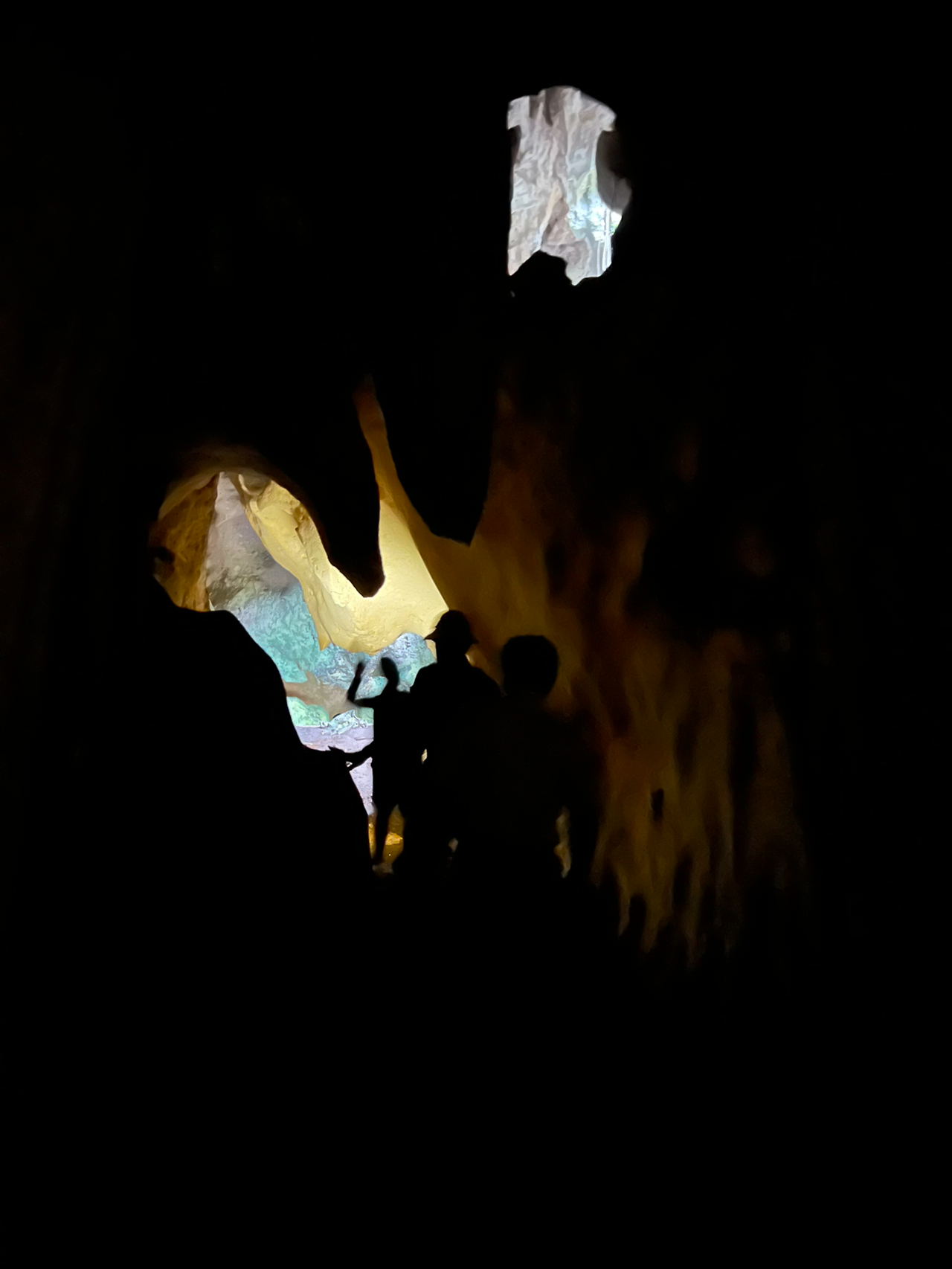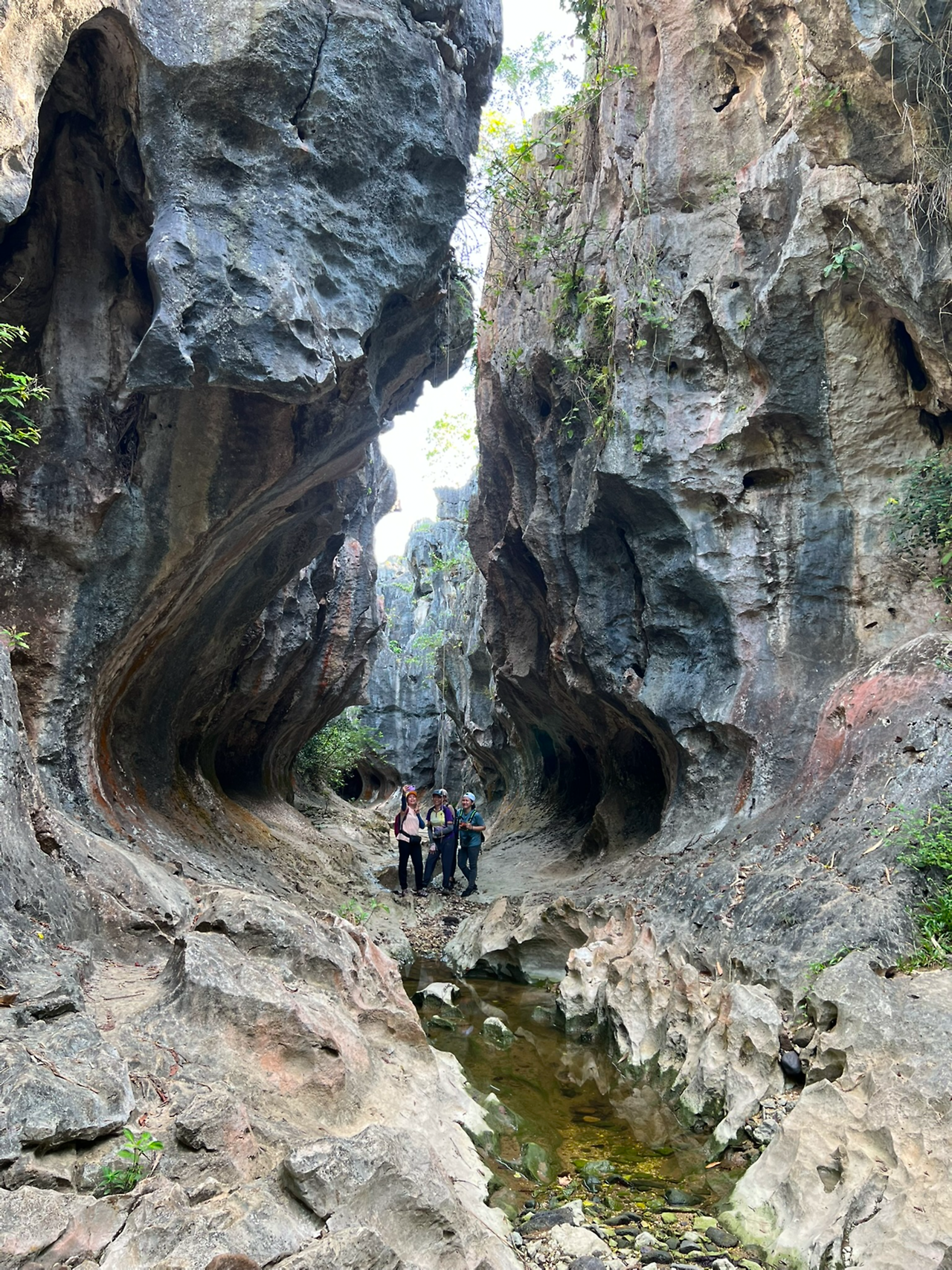 새로운 장애물이 보인다. 동굴이 급격히 아래로 내려간다. 진흙이 묻어 축축한 바닥에 완전히 엉덩이를 대고 미끄럼 타듯이 내려가야 하는 구간이다. 등산복 바닥이 해질지도 모른다는 걱정이 든다. 축축해질 엉덩이를 어떻게 말려야지? 그렇지만 돌아갈 수도 없다. 가이드는 계속 앉으라고 재촉한다. 에라 모르겠다. 몸을 던졌다. 그러자 쉽게 미끄러져 내려갔다. '사즉생'이란 구절이 떠오른 순간이었다. 100미터 정도의 좁은 동굴을 통과하자, 넓고 근사한 계곡의 옆구리로 빠져나온다. 계곡은 둥근 원형의 단면을 갖고 있다. 수천 년 동안 흐른 물이 이 근사한 협곡을 만들지 않았을까 싶다. 지금은 바닥에 물이 없다. 간간히 고여있을 뿐이다. 동굴을 빠져나왔다는 안도감이 든다. 일행 모두 사진 찍느라 바쁘다.