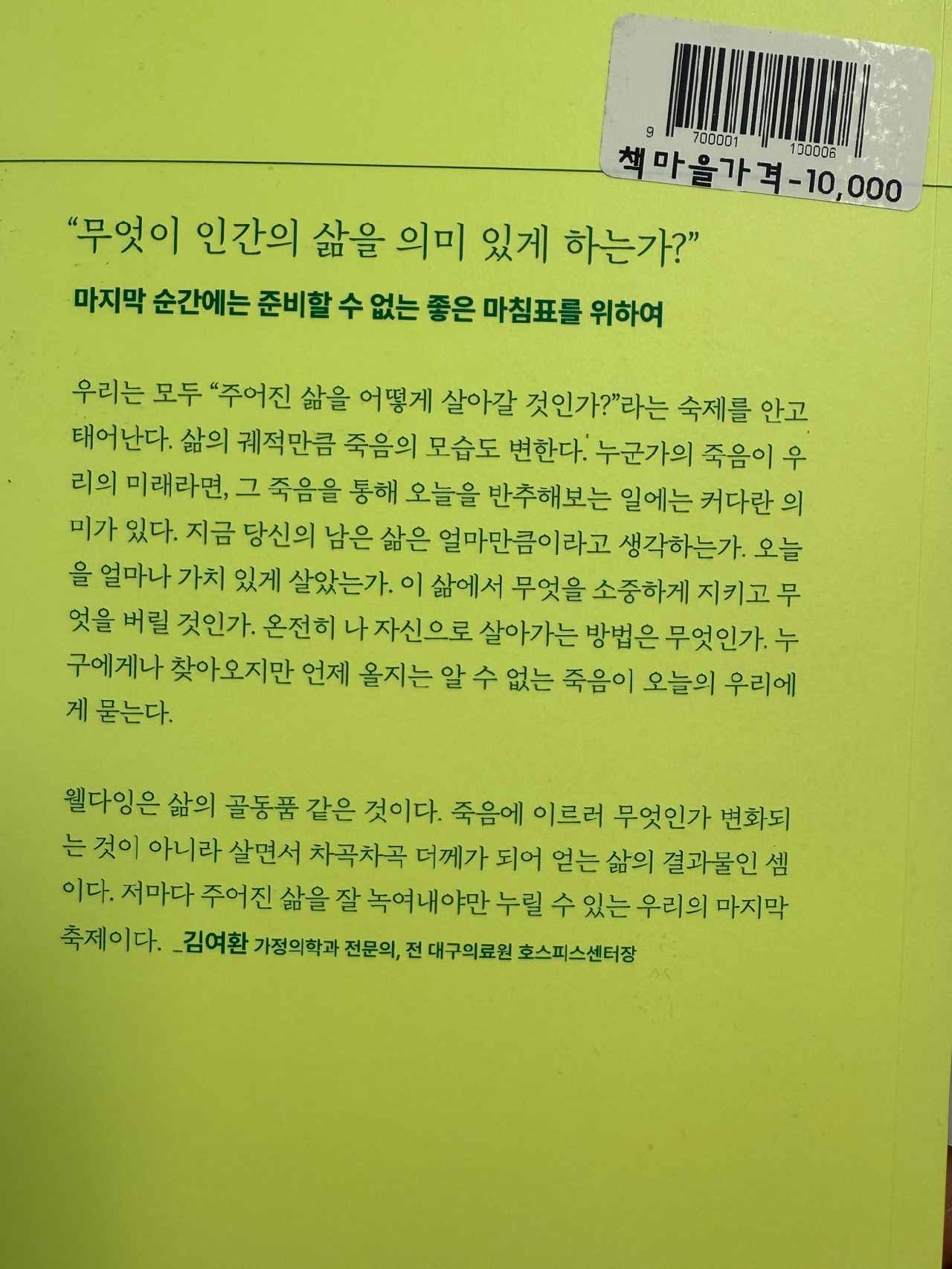 인생을 살면서 '무슨 일이 있었는지'보다 더 중요한 것은 ‘어떻게 살았는지'와 '무엇을 위해 살았는지'이다. 삶의 끝에 이른 사람들을 돌보면서 얻은 가장 큰 교훈은 '왜'가 아니라 '무엇을 위해'에 답해야 한다는 것이다.(다행이다. 난 이미 답을 갖고 있으니...)
