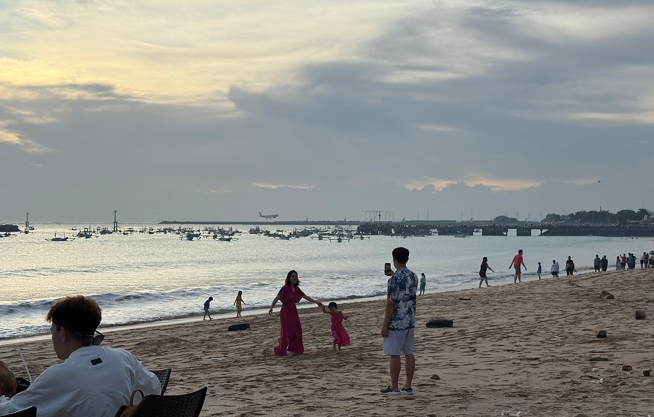 마지막 저녁을 짐바란 비치의 해산물 식당에서 했다. 저녁노을을 보기 좋은 곳이다. 노을과 함께 응우라 라이 공항의 활주로가 보인다. 계속 착륙하는 비행기들 사이로 이륙을 준비하는 비행기들이 여러 대 줄지어 서있다. 응우라 라이 공항은 활주로가 하나뿐인데 인도네시아에서 자카르타 공항 다음으로 붐비는 공항이라고 한다. 하루에 400편 가까운 비행기들이 뜨고 내린단다. 밀려드는 관광객을 받기 위해 공항터미널을 계속 개선 중이다. 5년 전보다는 입국이 확실히 간단해졌다. 그렇지만 아직도 도착비자 비용을 받고 있다. 지금은 도착비자를 온라인(43,500원 정도)으로 출국 전에 할 수 있다.